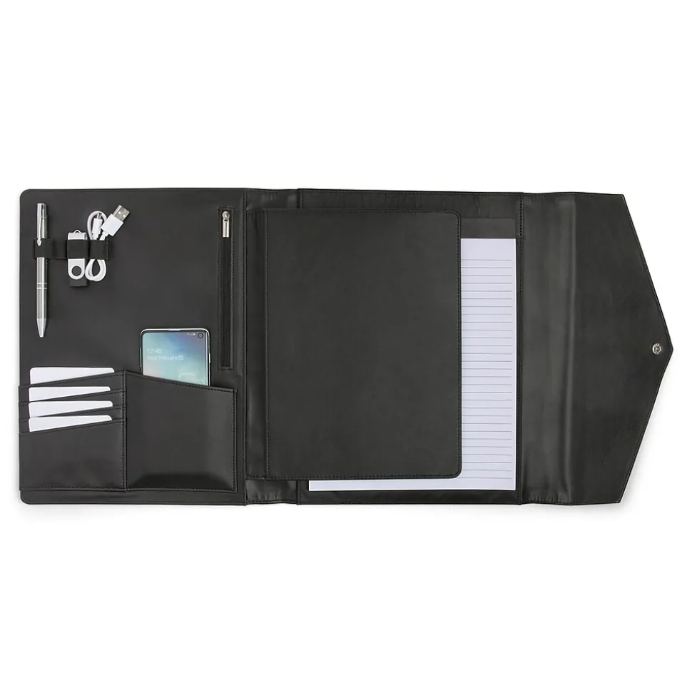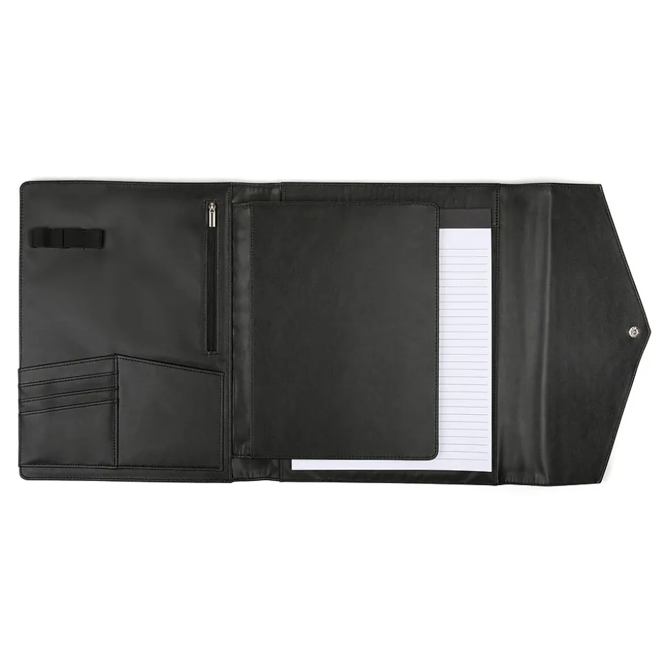 - Includes a letter-size white ruled writing pad which is quickly and easily replaced through a slit in the back cover