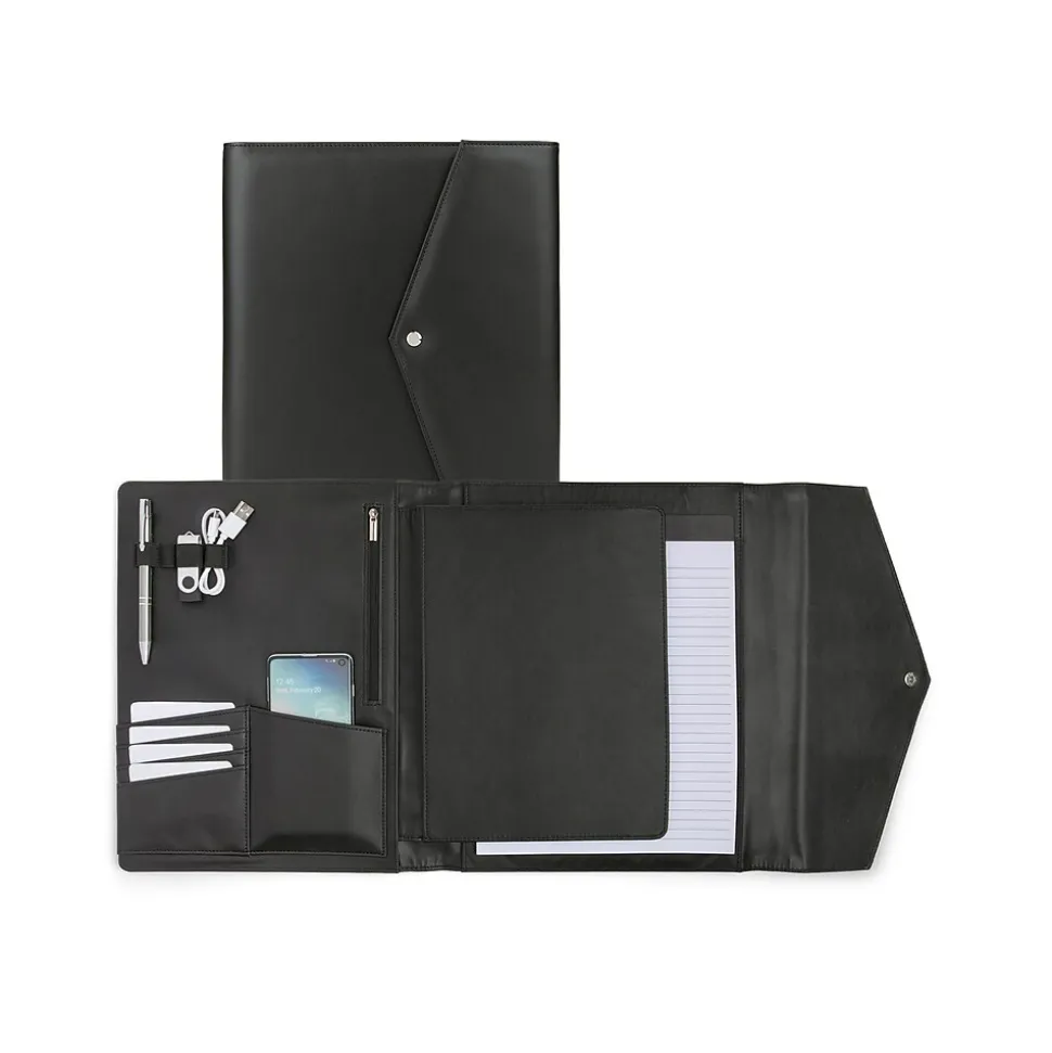 - Features a letter-size pocket on the inside front cover as well as a quick-access open pocket for loose items, card slots, and built-in pen holders
