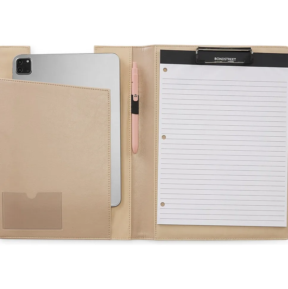 Attractive and convenient, this Bond Street vegan leather padfolio features a rigid back, an easily removable writing pad, and a place to store paper documents.
