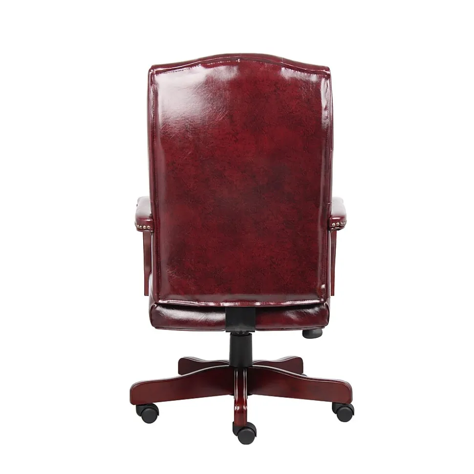 This classic styled, traditional button tufted, executive chair is beautifully upholstered in Oxblood Vinyl.The chair features hand applied individual antique brass nail-head trim.Pneumatic seat height adjustment and adjustable tilt tension control are included.