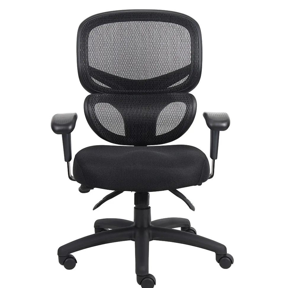 This multi-function task chair is made with Serene Soft fabric on the seat and a mesh back. It features a 27 inch nylon base with 2 inch nylon dual wheel castors for supreme comfort and a smooth roll. The chair offers a 3 paddle multi-function mechanism which allows one to adjust the seat and back to lock in any position throughout the tilt range. With an adjustable back, adjustable arms, a pneumatic gas lift for easy height adjustments, and a weight capacity of 275 lbs. this chair really is designed for anyone and everyone.