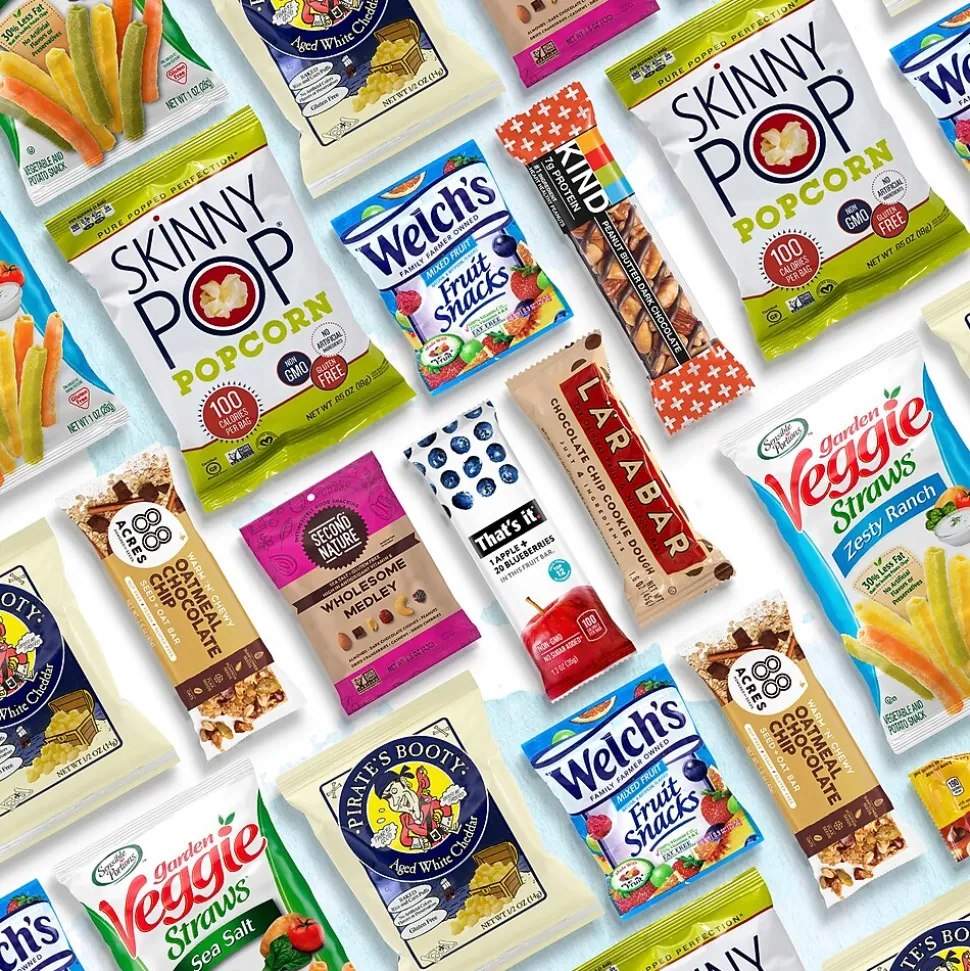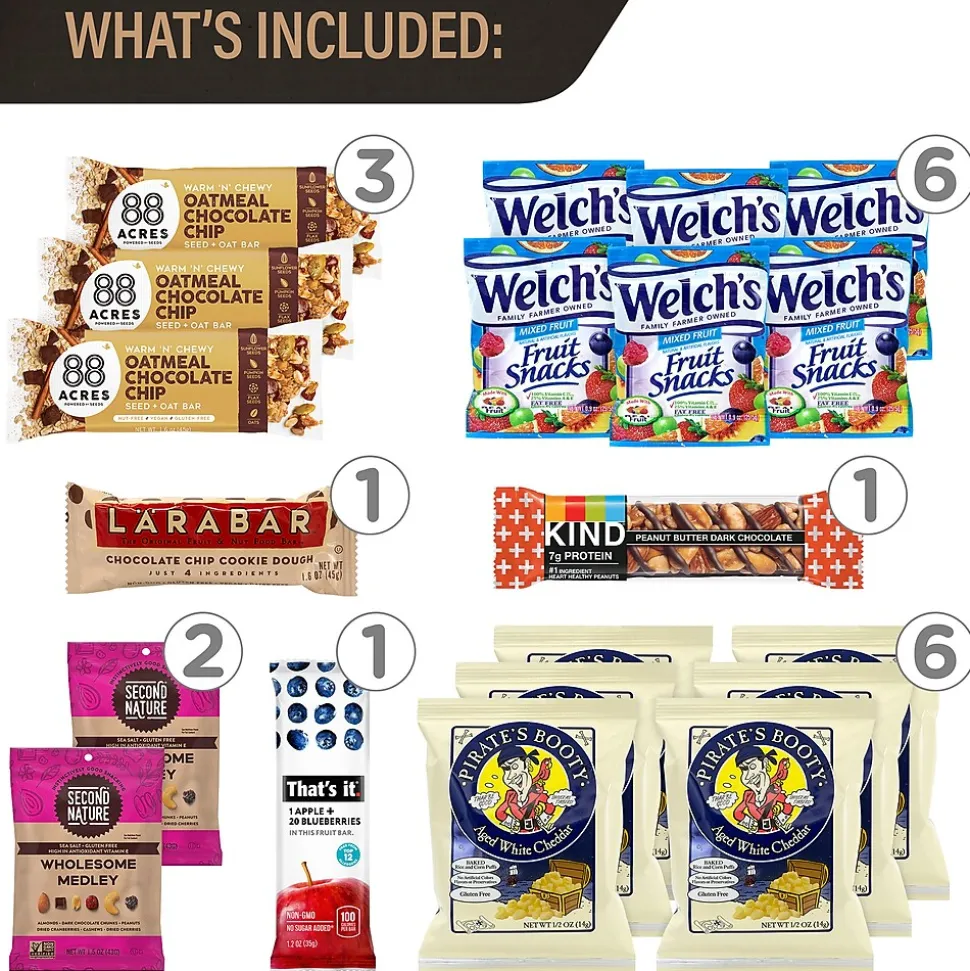 - Each box contains: six Skinny Pop 100 Calorie, six Sensible Portions Veggie Straw, six Pirates Booty, two Second Nature Naked Medley, one Kind Nuts & Spices Bars Variety, one That’s It Apple+Blueberry Fruit Bars, three 88 Acres Granola Bars, one Larabar Variety, six Welch’s Mixed Fruits Snacks