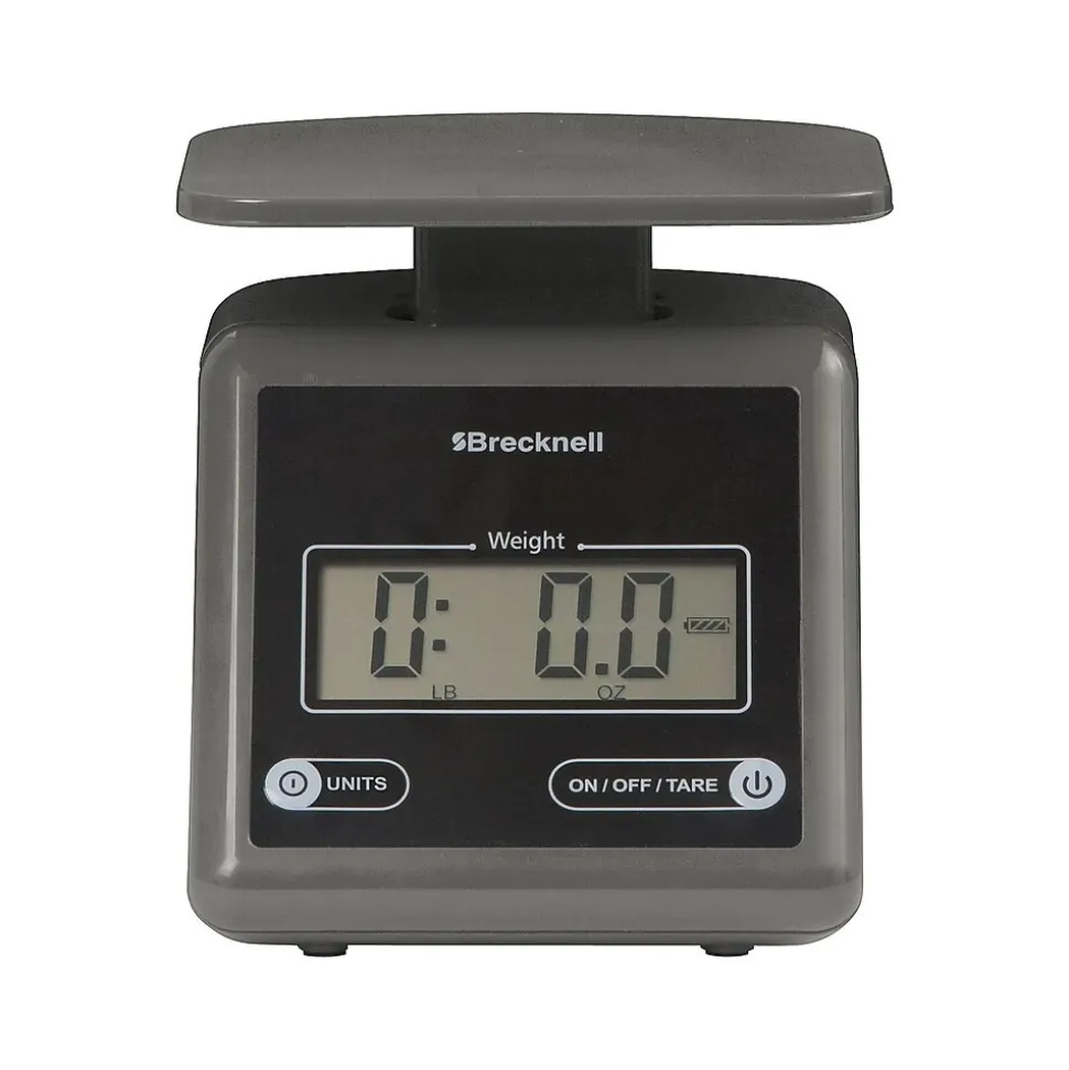 Weigh packages and envelopes with this postal scale to ensure compliance with shipping rates and ensure that shipments arrive on time. Rated for up to 7 pounds, this electronic scale can display measurements in pounds, grams, and ounces and can be tared to exclude the weight of containers. This Brecknell scale runs on two included AAA batteries, enabling use on any worktable or countertop.