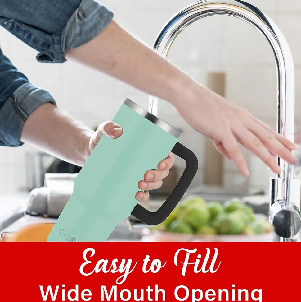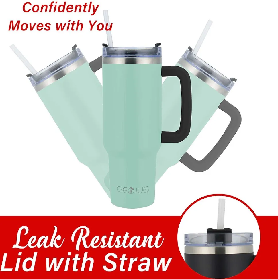The Brentwood® Geojug 40-Oz. Insulated Stainless Steel Tumbler Cup with Handle, Lid, and Straw quenches your thirst on the go. Conveniently take your favorite drinks anywhere and everywhere with the integrated comfort handle. The leak-resistant lid keeps spills away while the straw provides endless sipping comfort. The smartly designed travel mug fits in all kinds of cup-holders so you’re always in arms-reach of your drink. Stainless steel double-wall vacuum insulation keeps your beverages super hot or ice cold for hours and never sweats. Tasteless and odorless, pro-grade stainless steel is highly durable and super-easy to clean.