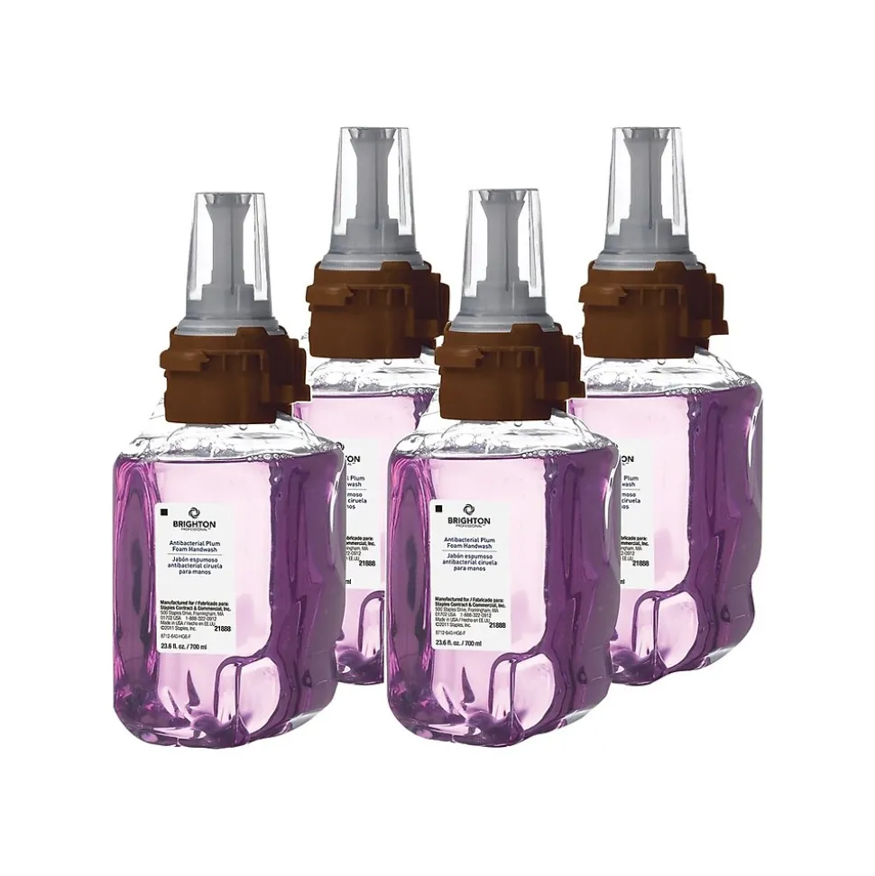 Prevent the spread of germs with this antibacterial foaming hand wash. Each soap refill in this 4-pack features a pleasant plum scent and works into a rich lather for a thorough clean. This antibacterial soap is formulated with benzalkonium chloride to wash away dirt and bacteria and is enriched with moisturizers and natural extracts to condition skin. These Brighton Professional antibacterial foaming soap refills are ideal for use in 700-milliliter-size soap dispensers.