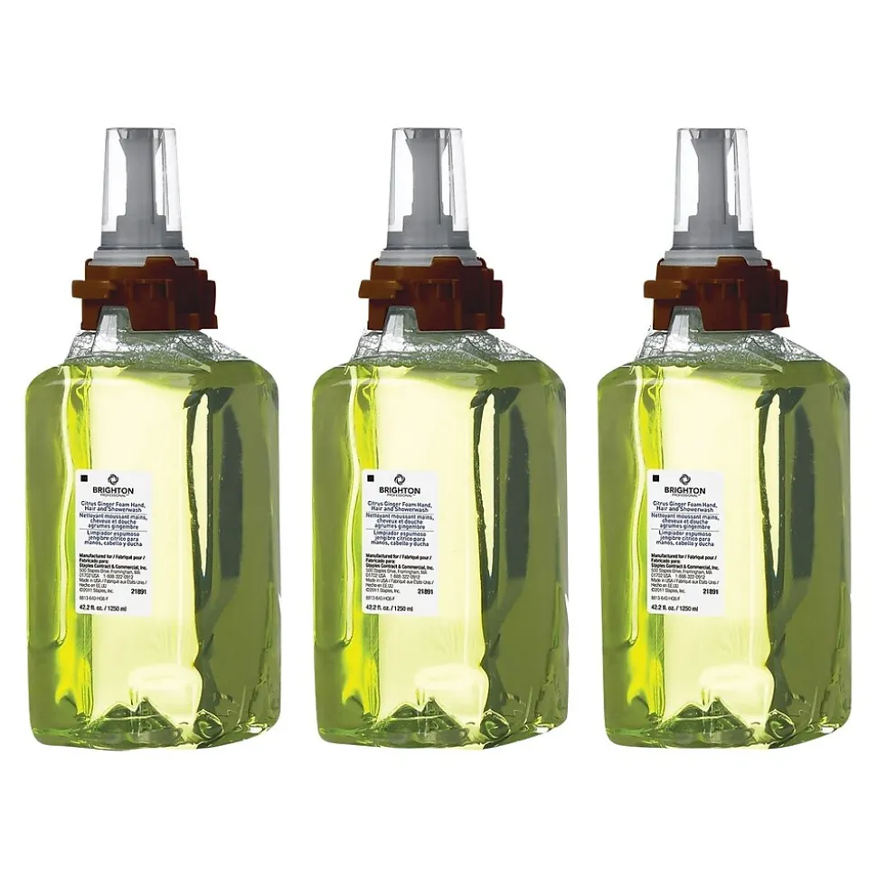 Wash away the day with this foaming hand, hair and shower wash. Enriched with moisturizers and natural extracts, this foam soap cleanses and conditions skin with a light citrus-ginger scent. These multipurpose soap refills fit in most standard 1,250-milliliter dispensers, and the removable pump makes recycling simple. With three bottles per carton, this set lets you stock up or supply a larger wash area. Brighton Professional foaming wash is EcoLogo-certified for reduced environmental impact.