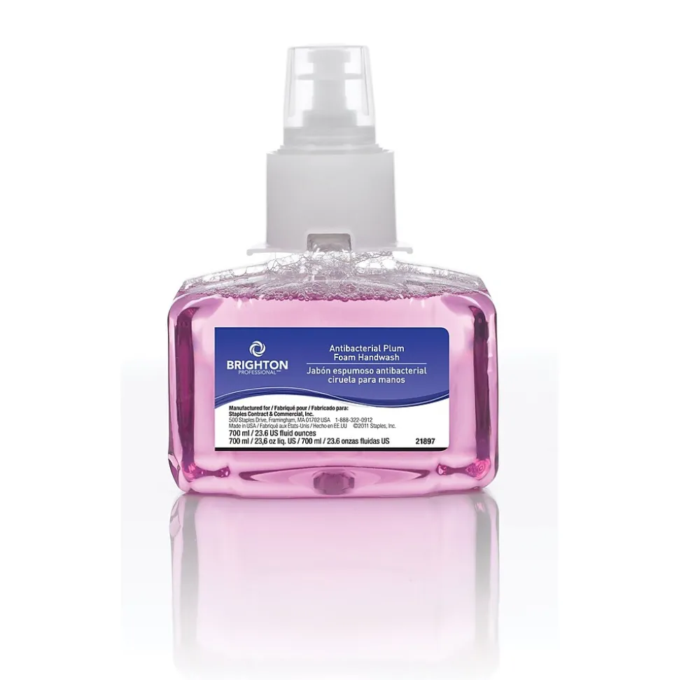 Brighton Professional touch-free refill foam soap removes grime from your hands to ensure clean work areas. The soap’s foaming action lets you clean your hands without dripping liquid on the floor, and its plum fragrance provides a pleasant bathroom atmosphere. Place these refills in touch-free dispensers in your bathroom or break room wash area to encourage good hygiene.