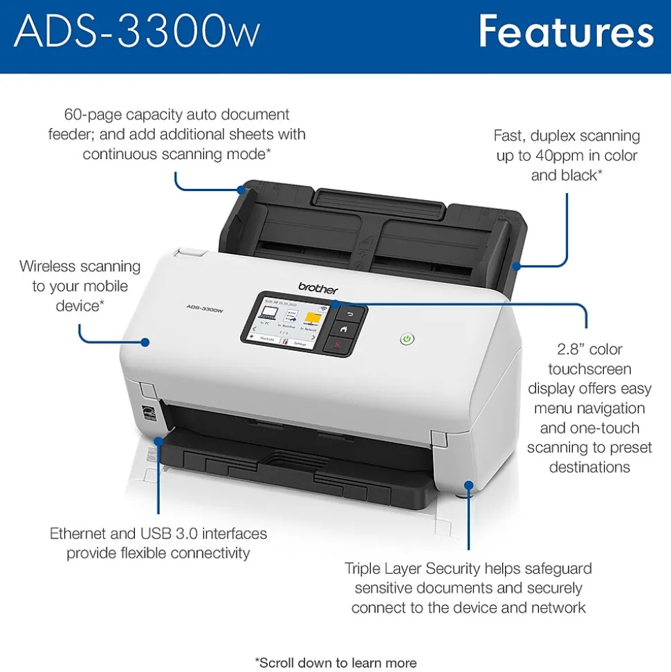 Small but mighty, the easy-to-use, affordable, and efficient Brother ADS3300W is a powerful addition to any small business or home office workspace. A versatile and reliable solution for mid-volume scanning, the machine scans to multiple destinations, and offers a range of connectivity options, including wireless/wired fast Ethernet network connectivity, or via the Brother Mobile Connect application for iOS and Android. Engineered for exceptional ease of use with a 2.8″ color touch screen, the ADS3300W performs single- or dual-sided document scanning, with an impressive capacity of up to 60 pages via the built-in auto document feeder with additional page-continuous scanning. Spend less time waiting and more time scanning. With a speed of up to 40 ppm, the scanner quickly handles a wide variety of media types and paper sizes, including legal-size and long paper, business, and plastic ID cards, receipts, and even photos. Bid farewell to frustration, and remove the guesswork from scanning with the built-in auto size detection. Seamlessly transition from scanning smaller items like business cards to longer documents like legal contracts at the touch of a button.