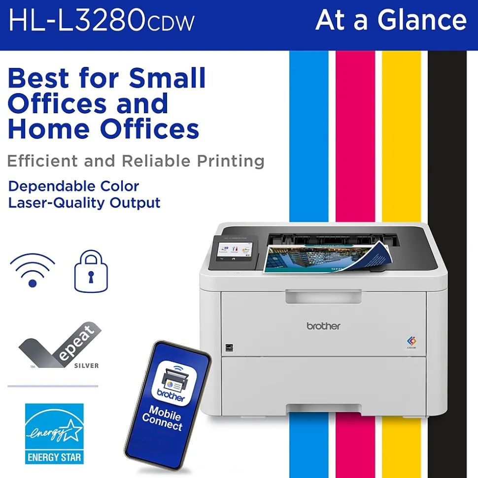 Engineered to optimize efficiencies while working from home or in offices or co-working spaces, the Brother HL-L3280CDW wireless digital color printer is compact, capable, and reliable. Combining steady connectivity options with consistent performance, this high-volume printer produces premium, smudge-free laser-quality documents that position you for success. It’s ready to get to work whenever you are with print-forward features including speeds up to 27 pages per minute (ppm)(1), an intuitive 2.7” touchscreen, dual-band wireless connectivity(2), and mobile device compatibility(3) for convenience, ease of use, and accessibility. Advanced security features safeguard sensitive data and offer peace of mind reassurance while printing. Engineered and supported by Brother, the HL-L3280CDW fits perfectly into any small, bustling workspace.