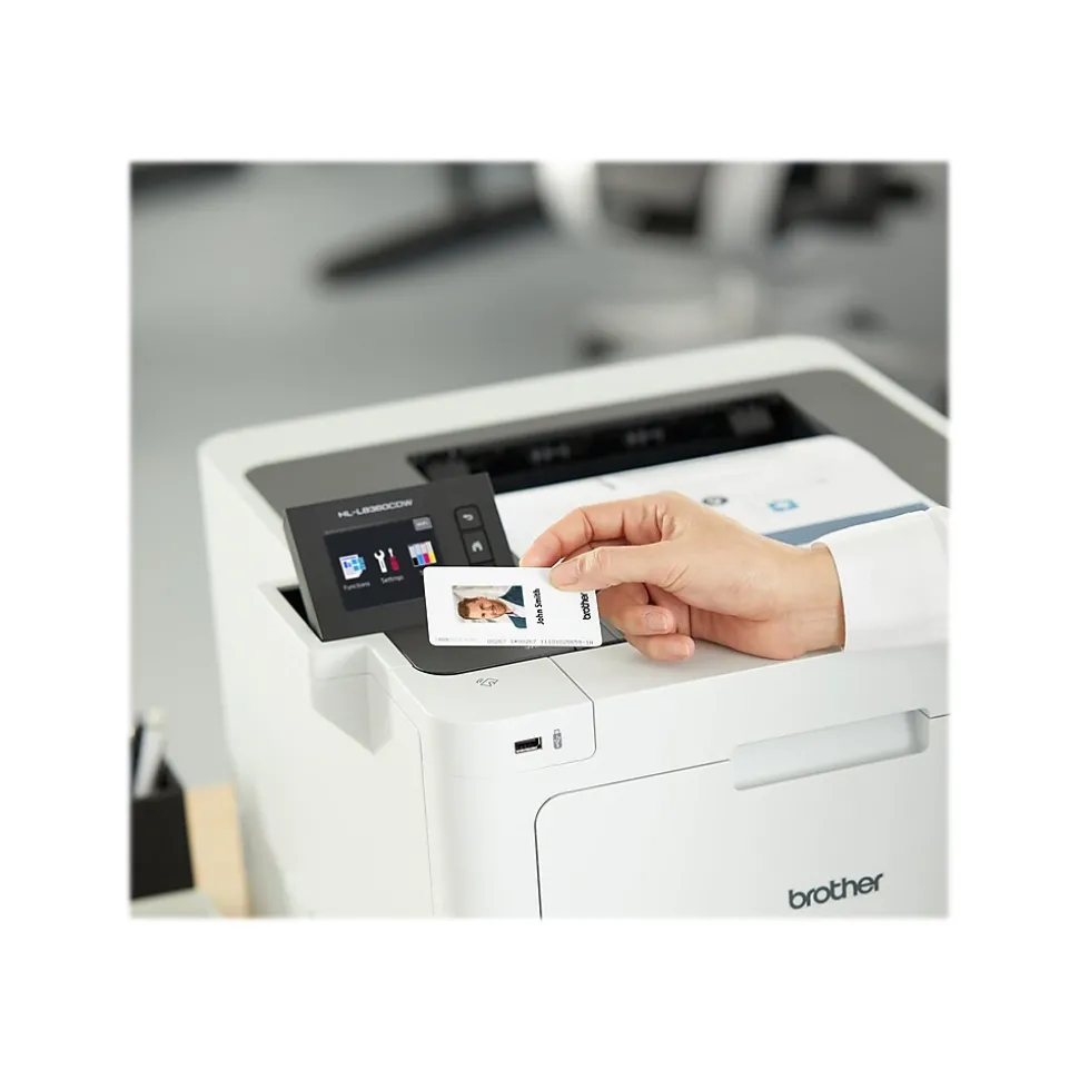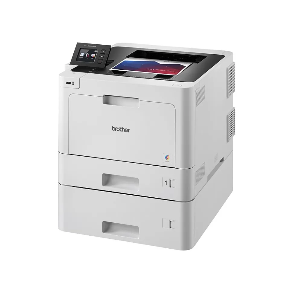 Accelerate workplace productivity and print high-quality documents by using this color laser printer. A 2.7-inch touchscreen makes it easy to queue up jobs and adjust print settings, while integrated Wi-Fi connectivity lets you print directly from cloud services, office computers, and smartphones. Print speeds of up to 33 pages per minute make handling high-volume tasks simple, while a maximum resolution of 2400 x 600 dpi ensures printed documents look crisp and detailed. Enjoy uninterrupted printing performance with the 750-sheet input tray that can complete most high-volume jobs without needing to be refilled. The 50-sheet multipurpose tray allows for printing on envelopes and nonstandard paper sizes, while the 150-sheet output tray helps keep documents in order after printing. Featuring an 800MHz processor and 512MB of print memory, this Brother printer boots up quickly and delivers fast responsive performance.