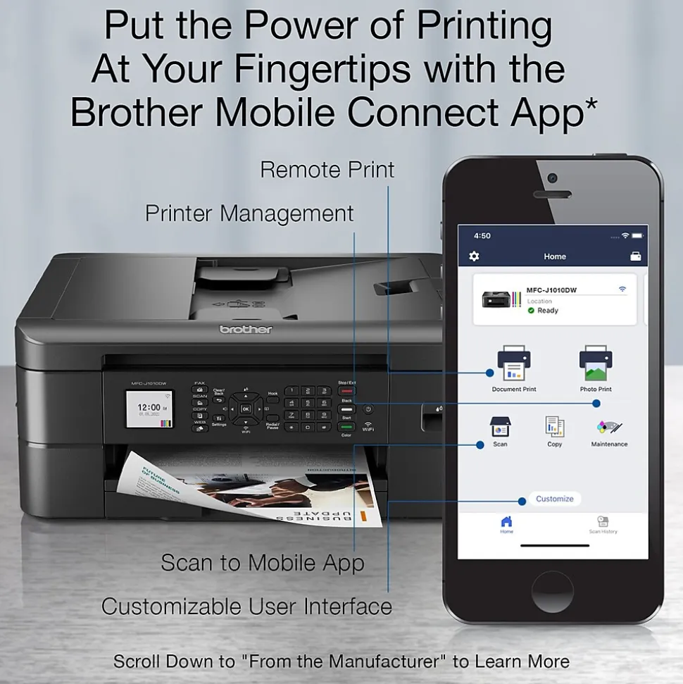 The affordable Brother MFC-J1010DW is an ideal color inkjet all-in-one printer for your home, home office or small office. It includes robust features and business-centric functionality not normally found in similarly priced inkjet printers plus print speeds up to 17 ppm for black and white and 9.5 ppm for color. The MFC-J1010DW is easy to connect and operate along with being compact and economical, perfect for small spaces and budgets. This wireless printer has multiple flexible connection options, including a built-in wireless interface for sharing with multiple users on your network, Wi-Fi Direct® or connect locally to a single computer via a USB interface. Delivering high quality, reliable printing, copying, scanning and faxing and enabling wireless printing from your desktop, laptop, smartphone or tablet. Use the 1.8” color display to easily navigate on screen menus. This printer features the Brother Mobile Connect App, a user-friendly interface that gives you the freedom to print and manage your printer from virtually anywhere. The MFC-J1010DW also features the unique Brother Page Gauge which estimates remaining page levels, so you always know how much ink you have left. Use the 20-page capacity automatic document feeder or the 150-sheet capacity adjustable paper tray for generous output without constant monitoring. Two-sided printing helps save paper, while mobile device printing and Cloud connectivity let you print-from and scan-to popular Cloud services directly from the device. Comes with a 1-year limited warranty and free online, live chat or phone support for the life of the printer.