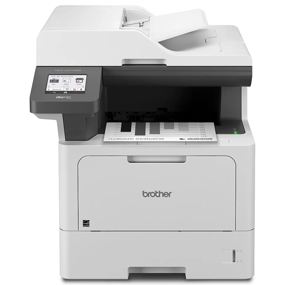 This high-performance all-in-one printer helps to increase productivity with fast print and copy speeds up to 48ppm(1). Delivers cost-efficient printing by using the Brother Genuine TN920XXL super high-yield replacement toner cartridge. Triple Layer Security features help to limit document and device access and protect against network intrusions. Offers expandable paper capacity that is scalable as your business needs grow. Quickly scan multi-page documents to a wide variety of destinations using the 50-page capacity(2) auto document feeder. The 3.5” touchscreen display allows for the creation of customized shortcuts to your most frequently used workflows. The MFC-L5710DW also provides flexible connectivity with built-in Gigabit Ethernet and dual band wireless networking, plus convenient mobile device printing to meet mobile workforce demands(3).