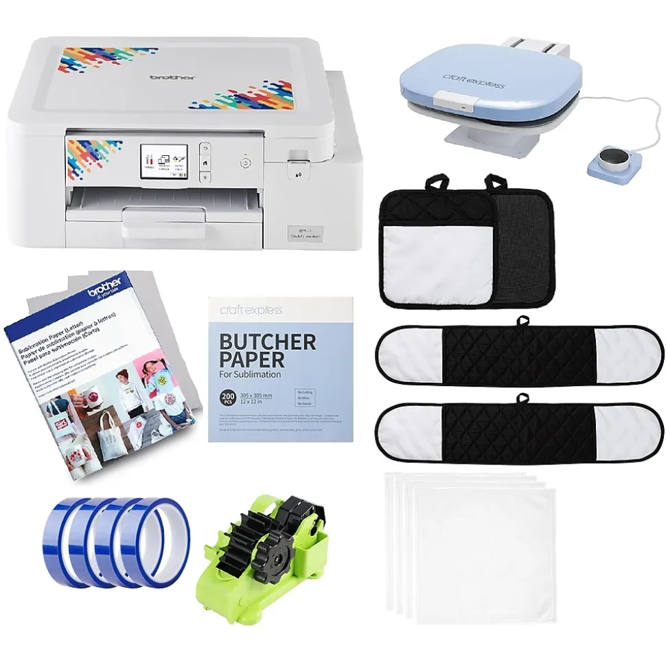 This DIY crafter’s bundle includes: Brother SP1 sublimation printer and 100 sheets 8.5″x11″ sublimation paper, Craft Express Elite Auto 12″x15″ Heat Press, 2-pack black sublimation pot holders with pocket, 2-pack black sublimation double mitt long pot holders, 4-pack 12″x12″ sublimation kitchen towels, 4 rolls heat-resistant tape, thermal tape dispenser, 200 sheets 12″x12″ butcher paper.