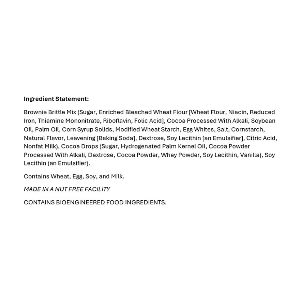 - Ingredients: brownie brittle mix (sugar, enriched bleached wheat flour, cocoa processed with alkali, soybean oil, palm oil, corn syrup solids, modified wheat starch, egg whites, salt, cornstarch, natural flavor, leavening, dextrose, soy lecithin, citric acid, nonfat milk), cocoa drops (sugar, hydrogenated palm kernel oil, cocoa powder processed with alkali, dextrose, cocoa powder, whey powder, soy lecithin, vanilla), soy lecithin