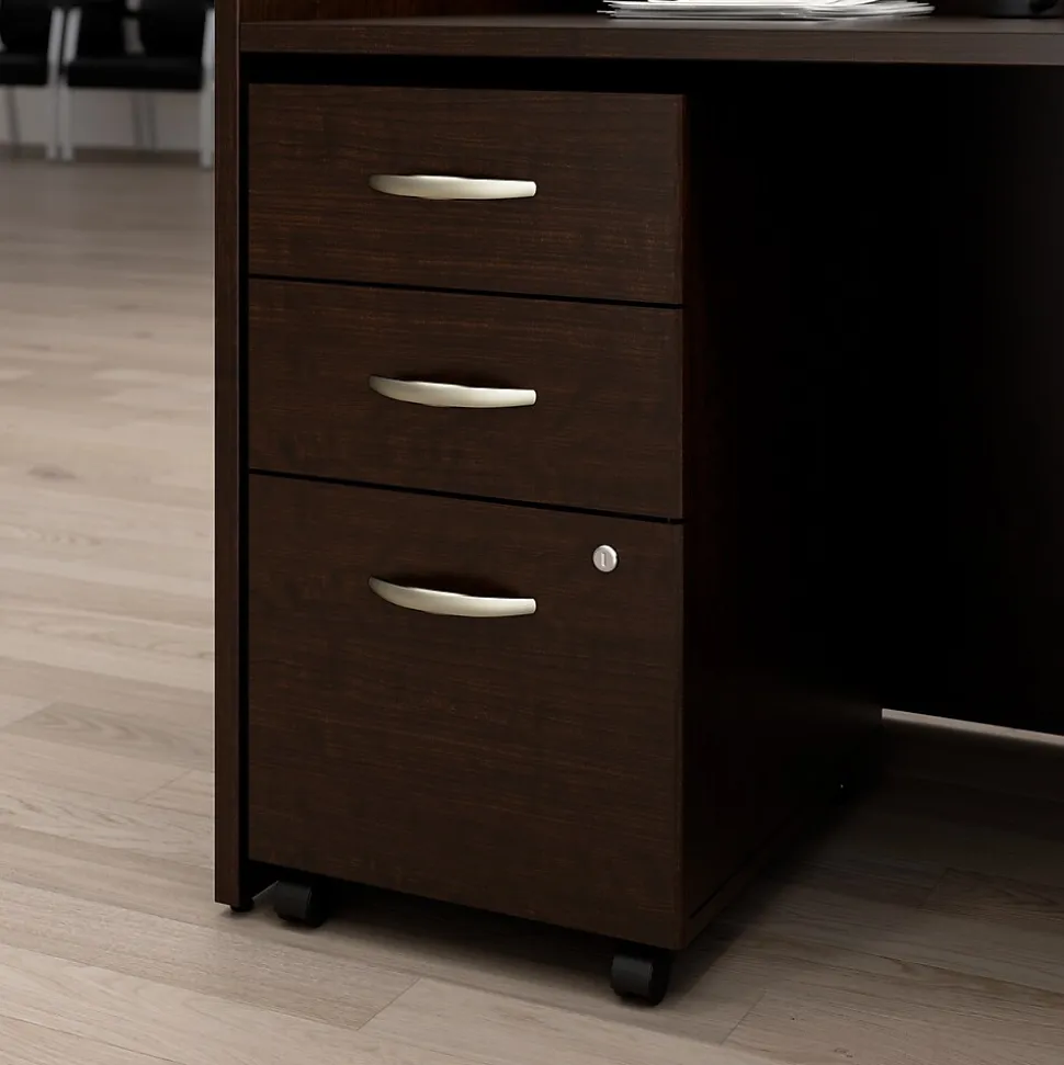The Bush Business Furniture Arrive 3 Drawer Mobile File Cabinet presents an ideal way to add practical under desk storage to your reception area. Dual-wheeled casters allow the rolling file cabinet to move effortlessly throughout your space to provide convenient organization where it’s needed most. The file drawer opens on smooth full-extension ball bearing slides for an easy reach to letter, legal, and A4-size paperwork while two box drawers store writing utensils, notepads, and other small office supplies. A single lock secures the two bottom drawers to protect sensitive documents and valuable items. This commercial-grade portable filing cabinet has been meticulously tested to meet or exceed ANSI/BIFMA quality standards for safety, durability, and performance and is backed by the Bush Business Furniture 10 Year Manufacturer’s Warranty. American made with U.S. and imported parts.