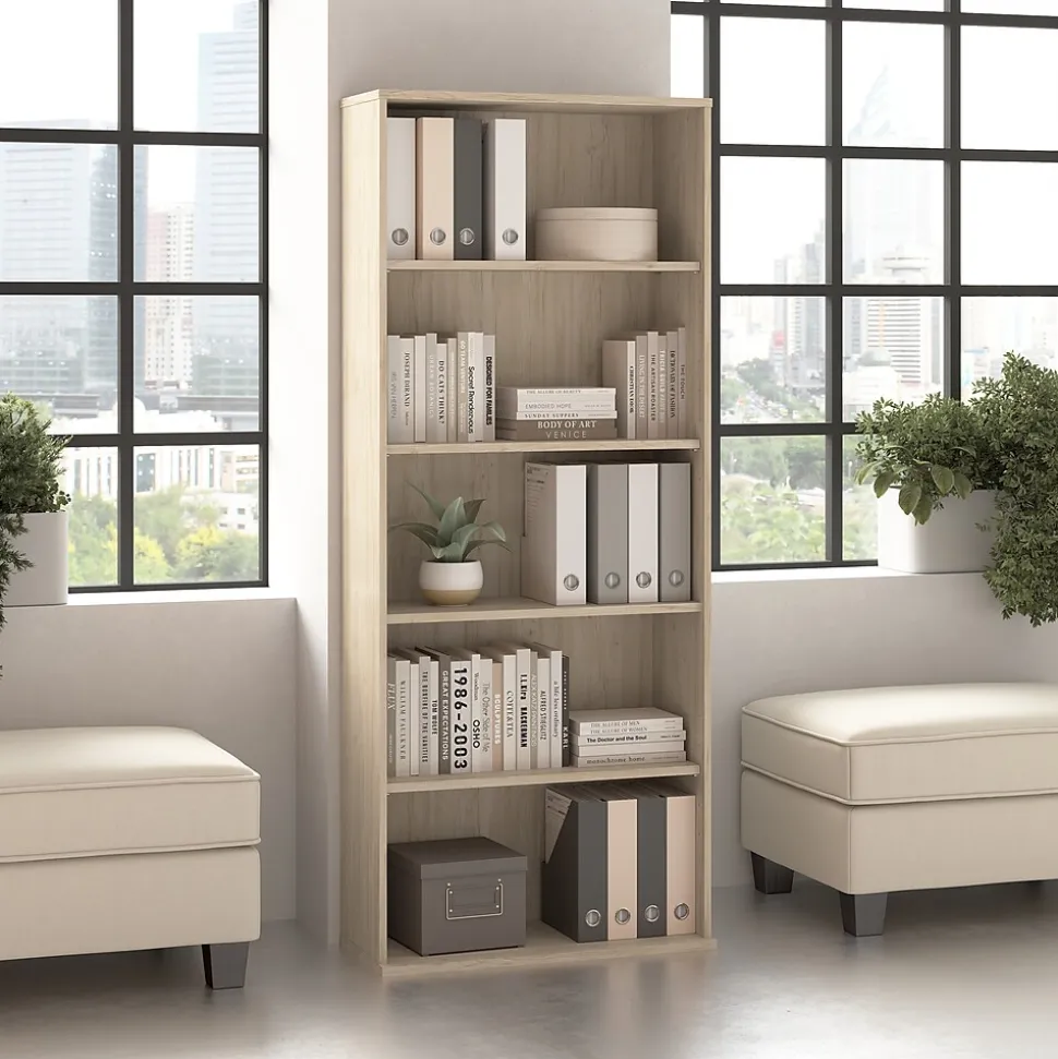 The Bush Business Furniture Hustle Tall 5 Shelf Bookcase provides the form and function needed to support your entrepreneurial spirit without breaking the bank. An ideal choice for small to medium-size businesses and home offices alike, this tall bookshelf is a great way to organize reference materials and give your workspace a personal touch with plants, pictures, and decorations. Two shelves are fixed for stability while three can be raised or lowered to accommodate items of various sizes. Each shelf supports up to 50 pounds. A stable design and wall attachment hardware make the modern bookcase a safe choice for virtually any work or living space. This office bookshelf has been meticulously designed and tested to meet or exceed ANSI/BIFMA standards for safety, durability, and performance and is backed by a 10 Year Manufacturer’s Warranty. American made with U.S. and imported parts.