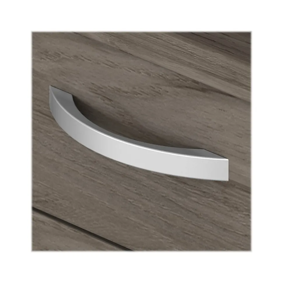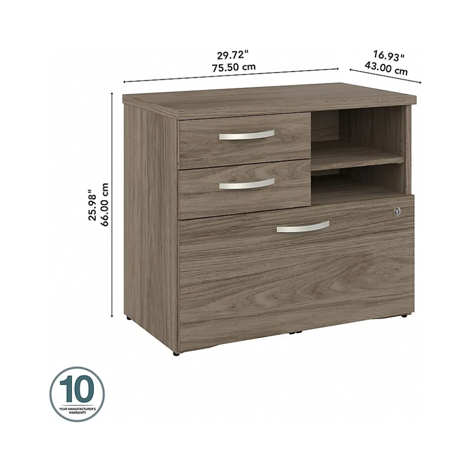 The Bush Business Furniture Hybrid office storage cabinet with drawers and shelves offers a stylish, long-lasting workplace organization solution for the modern professional. Keep important documents, office supplies, work in progress, and equipment in order, so you can access the materials you need quickly and easily. A file drawer opens on smooth full-extension ball bearing slides for an effortless reach to letter-, legal-, and A4-size paperwork and can be locked to protect sensitive information. Two box drawers organize writing utensils, notepads, and other supplies, while the open shelves are ideal for frequently used items. The file storage cabinet’s stable design and included wall attachment hardware make it a safe choice for use in virtually any home or professional office environment. Find the perfect look for your space with five contemporary finish options: black walnut, modern hickory, platinum gray, storm gray, and white. This lateral file cabinet with shelves has been meticulously tested to meet or exceed ANSI/BIFMA quality standards for safety, durability, and performance and is backed by the Bush Business Furniture 10-year manufacturer warranty. See the full Bush Business Furniture Hybrid collection for coordinating items to enhance your workspace as needed, including computer desks, bookcases, and storage cabinets (coordinating items sold separately). American-made with US and imported parts.