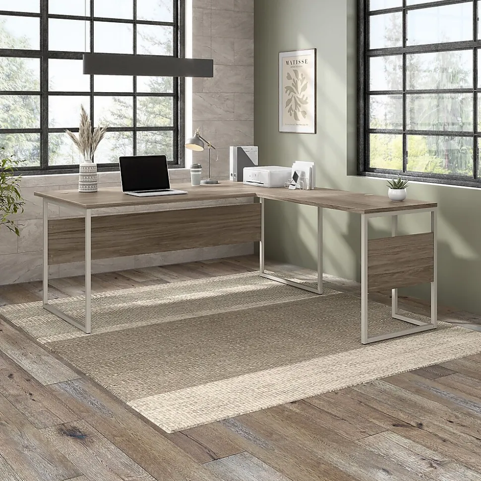 The Bush Business Furniture Hybrid L-shaped table desk blends a durable work surface with sturdy metal legs to offer a stylish, long-lasting solution for the modern professional. Tackle your next project or assignment with a computer, books, and more on a desktop that supports up to 200 lbs. Four built-in wire management grommets keep cords and cables in order, so your work area remains free from unnecessary clutter. The corner desk’s open leg design and finished privacy panel allows it to look great facing any direction in a home or professional office environment. This modern computer desk has been meticulously tested to meet or exceed the ANSI/BIFMA standards for safety, durability, and performance and is backed by a 10-year manufacturer warranty. American-made with US and imported parts.