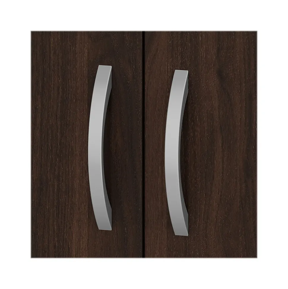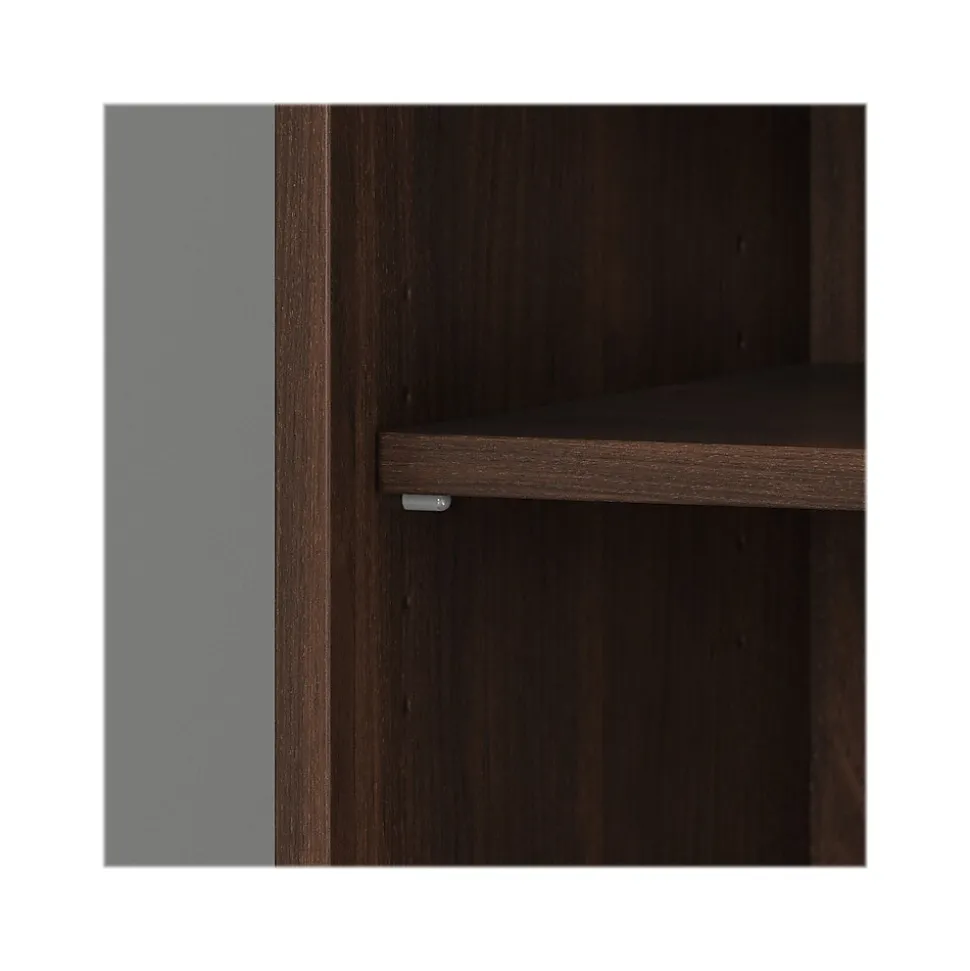 The Bush Business Furniture Hybrid tall five-shelf bookcase with doors offers a stylish, long-lasting storage and display solution for the modern professional. Organize books and other reference materials, or give your workspace a personal touch with pictures and decorations on shelves that support up to 50 lbs. each. Two shelves are fixed for stability, while three can be raised or lowered to accommodate items of various sizes. Cabinet doors conceal the two lower shelves for the materials you want to be kept in order but out of sight. The tall bookshelf’s stable design and included wall attachment hardware make it a safe choice for use in virtually any home or professional office environment. Find the perfect look for your space with five contemporary finish options: black walnut, modern hickory, platinum gray, storm gray, and white. This tall bookcase cabinet has been meticulously tested to meet or exceed ANSI/BIFMA quality standards for safety, durability, and performance and is backed by the Bush Business Furniture 10-year manufacturer warranty. See the full Bush Business Furniture Hybrid collection for coordinating items to enhance your workspace as needed, including computer desks, file cabinets, and storage cabinets (coordinating items sold separately). American-made with US and imported parts.