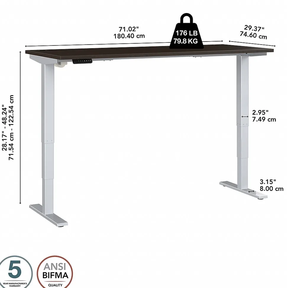Bush Business Furniture’s Move 40 Series Electric Height Adjustable Standing Desk is a perfect way to build an ergonomic workspace without the high-end price tag. The 72W x 30D desktop lifts anywhere from 28 to 48 inches from the floor at a speed of 1.25 inches per second. The control panel includes four programmable presets that save your favorite heights so you can change positions without missing a beat. The Adjustable Desk also features an Anti-Collision Sensor that stops movement up or down if an object is detected. Built to endure the rigors of a busy professional environment, the thermally fused laminate work surface resists scratches and stains while a welded 16-gauge steel base allows the desktop to support up to 176 pounds. This Ergonomic Office Desk has been tested to meet or exceed ANSI/BIFMA standards for safety, durability and performance and is backed by a 5 Year Warranty.