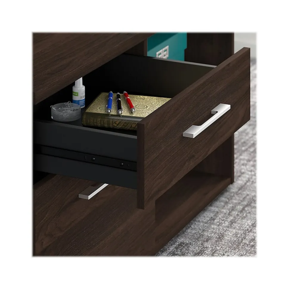 The Bush Business Furniture Office 500 low storage cabinet with drawers and shelves features a practical design that’s perfect for the modern workplace. The Bush Business Furniture Office 500 low storage cabinet with drawers and shelves presents a practical solution for keeping work materials organized in any professional space. On the left side of the cabinet a file drawer with smooth full-extension ball bearing slides holds legal-, letter-, and A4-size paperwork, while a box drawer stores miscellaneous office supplies. A single lock secures both drawers to protect sensitive documents and personal items. The right side features one fixed shelf and one adjustable shelf to accommodate books, binders, and reference materials of various sizes. The surface of the low storage credenza makes a great printer stand or laptop charging station and can also be used to display decorations. This office cabinet is tested to meet ANSI/BIFMA standards for safety and performance and is backed by a 10-year warranty. American-made with US and imported parts.