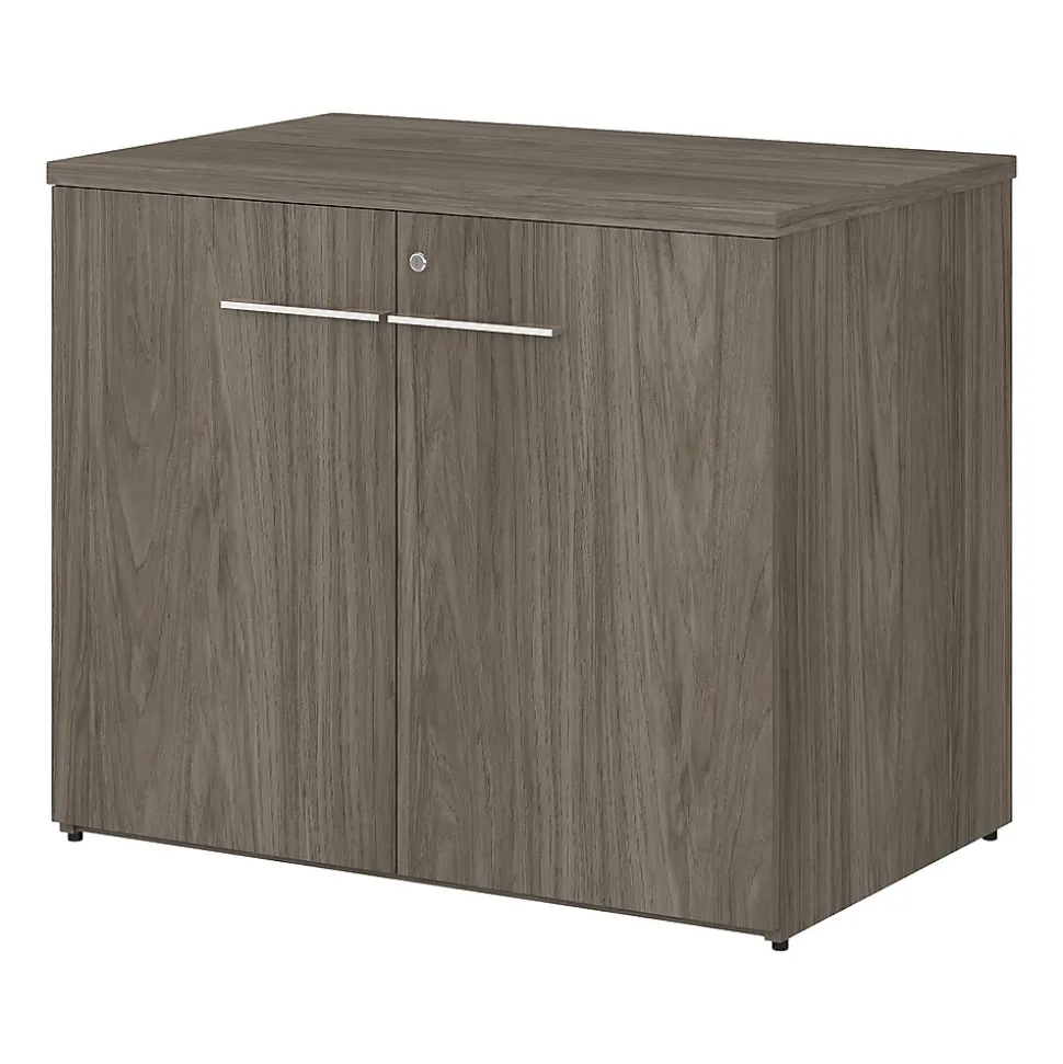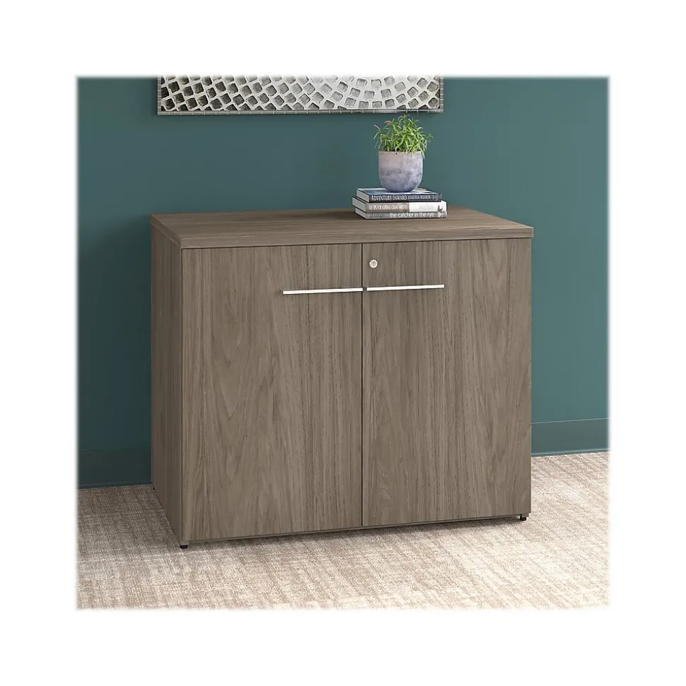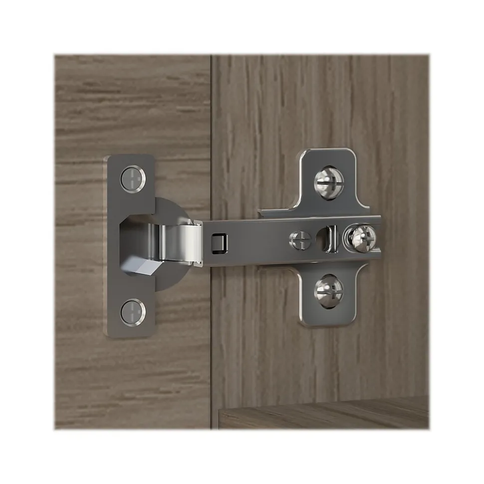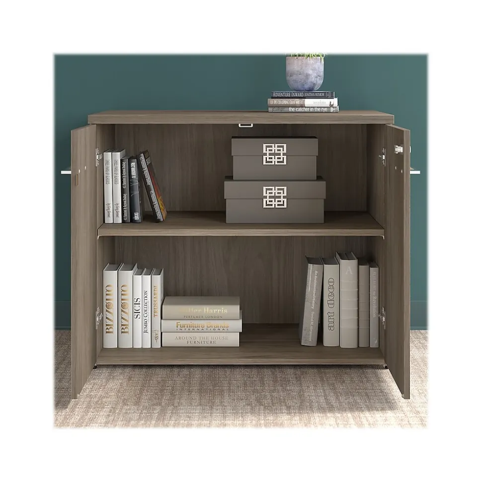 With its sophisticated style and practical design, the Bush Business Furniture Office 500 storage cabinet with doors is a perfect fit for modern workspaces. This storage cabinet offers an efficient and secure way to organize materials in any workspace. With one fixed shelf and one adjustable shelf that support up to 50 lbs. each, this two-door cabinet is a perfect solution for storing office supplies and reference materials of various sizes. Doors feature smooth Euro-style hinges for easy access to contents and can be locked to protect valuable items. The back panel includes a built-in wire management grommet to accommodate electronic devices like a laptop or router and modem set. A single accent cabinet accepts the coordinating 36″W bookcase hutch while a set of two can accept a 72″W desk hutch (hutches sold separately). This locking storage cabinet is tested to meet ANSI/BIFMA standards for safety and performance and is backed by a 10-year warranty. American-made with US and imported parts.