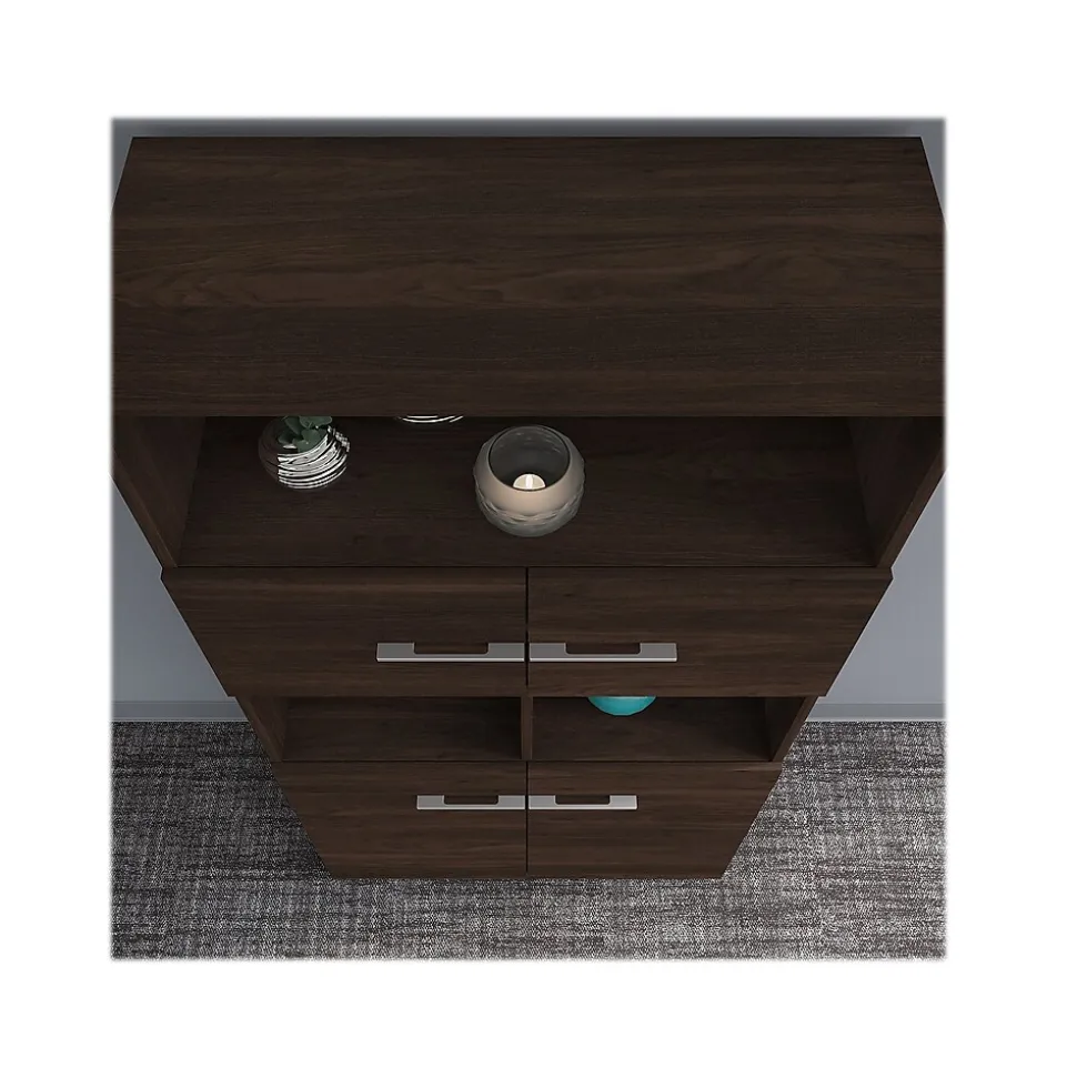 The Bush Business Furniture Office 500 five-shelf bookcase with doors is a great way to stay organized while showcasing your unique style and personality. Use the bottom storage cabinet to conceal the books, binders, and other reference materials you want to be kept in order but out of sight. The cabinet contains one fixed shelf and one adjustable shelf to accommodate items of various sizes. The upper half of the tall bookcase features two cubbies and a long top shelf that are perfect for displaying pictures, awards, and decorations. A smaller cabinet offers even more space to organize office supplies and materials. Shelves support up to 50 lbs. each. This modern bookcase with doors meets or exceeds ANSI/BIFMA quality standards for safety and performance and is backed by a 10-year manufacturer limited warranty. American-made with US and imported parts.