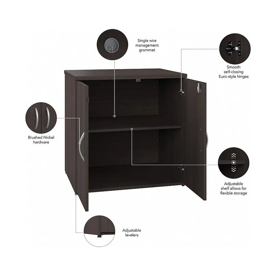 The Bush Business Furniture Studio C office storage cabinet with doors offers a stylish, long-lasting workplace organization solution for today’s professionals. The file storage cabinet’s stable design and included wall attachment hardware make it a safe choice for use in virtually any home or professional office environment. The cabinet can be locked for privacy. A single wire management grommet on the back panel allows for easy reach to cords and wires while keeping your cabinet organized. One adjustable shelf allows for flexible storage, while the adjustable leveling glides help with uneven floors. This lateral file cabinet has been meticulously tested to meet or exceed the ANSI/BIFMA quality standards for safety, durability, and performance and is backed by a 10-year manufacturer limited warranty. American-made with globally sourced materials.