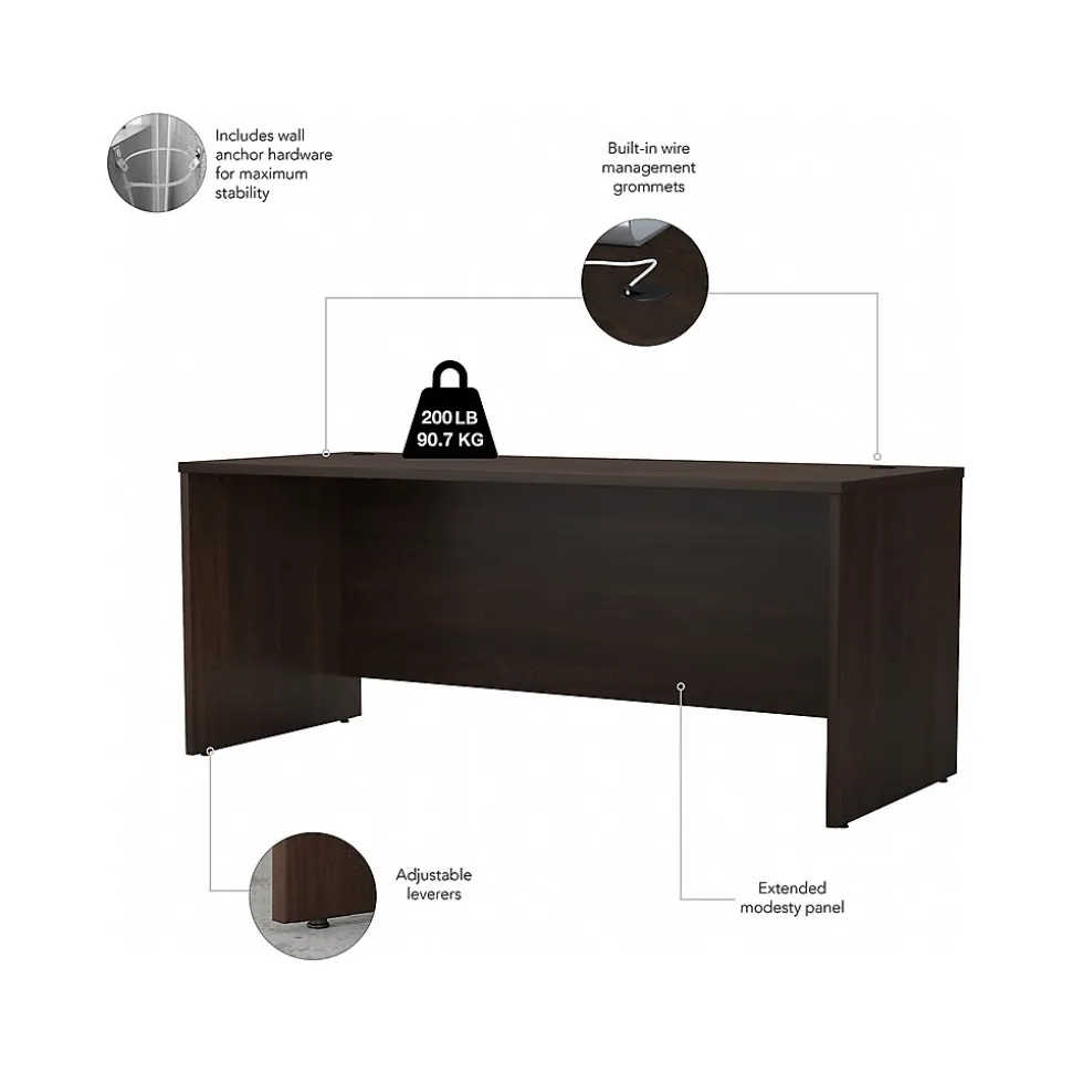 Choose the Bush Business Furniture Studio C 72″W office desk with mobile file cabinet for a durable workspace that looks great and lasts for years. The thermally fused laminate finish, edge banding, and end panels resist scratches, stains, and dents while standing up to the rigors of a 40-plus hour workweek. Keep computer cords out of your way with the cable management system for an organized work surface. The three-drawer file cabinet rolls throughout your office or remains in place as needed. A full-extension file drawer opens on smooth ball bearing slides for an easy reach to letter-, legal-, and A4-size paperwork while two box drawers organize supplies. A single lock secures the bottom drawers to protect sensitive documents and personal items. This desk with storage set comes with a 10-year manufacturer limited warranty and meets ANSI/BIFMA quality test standards. American-made with US and imported parts.