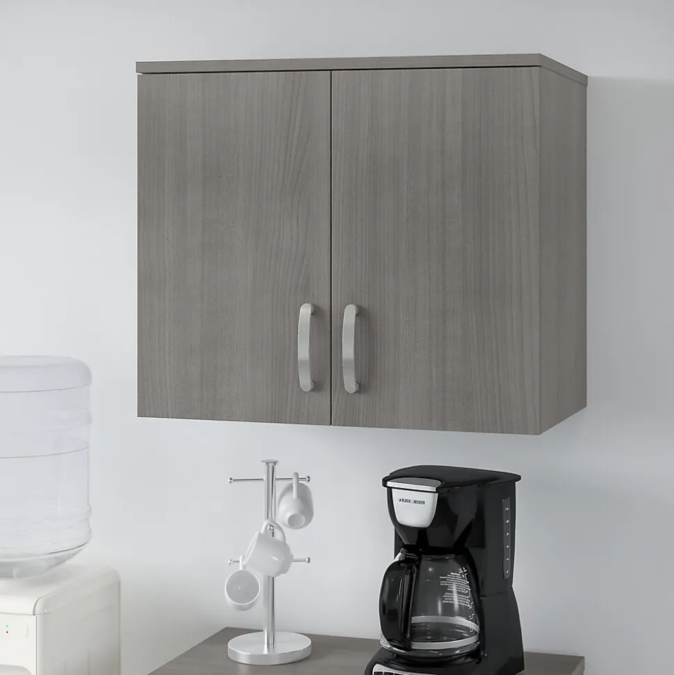 The Bush Business Furniture Universal wall cabinet with doors and shelves features a commercial-quality design and contemporary styling that suits virtually any home or professional environment. Organize your office, break room, garage, laundry room, or any other work or living space with a wall-mounted cabinet that’s built to last and boasts plenty of practical storage capacity. Cabinet doors with smooth Euro-style hinges open to reveal one fixed shelf and one adjustable shelf that accommodate office supplies, tools, and household items of various sizes. The total weight capacity of the small wall shelf is 30 lbs. For best use, mount wall studs 16″ apart during installation. This wall storage cabinet has been tested to meet ANSI/BIFMA standards for safety and performance and is backed by a 10-year warranty. Complete your space with Universal full line of modular storage solutions.
