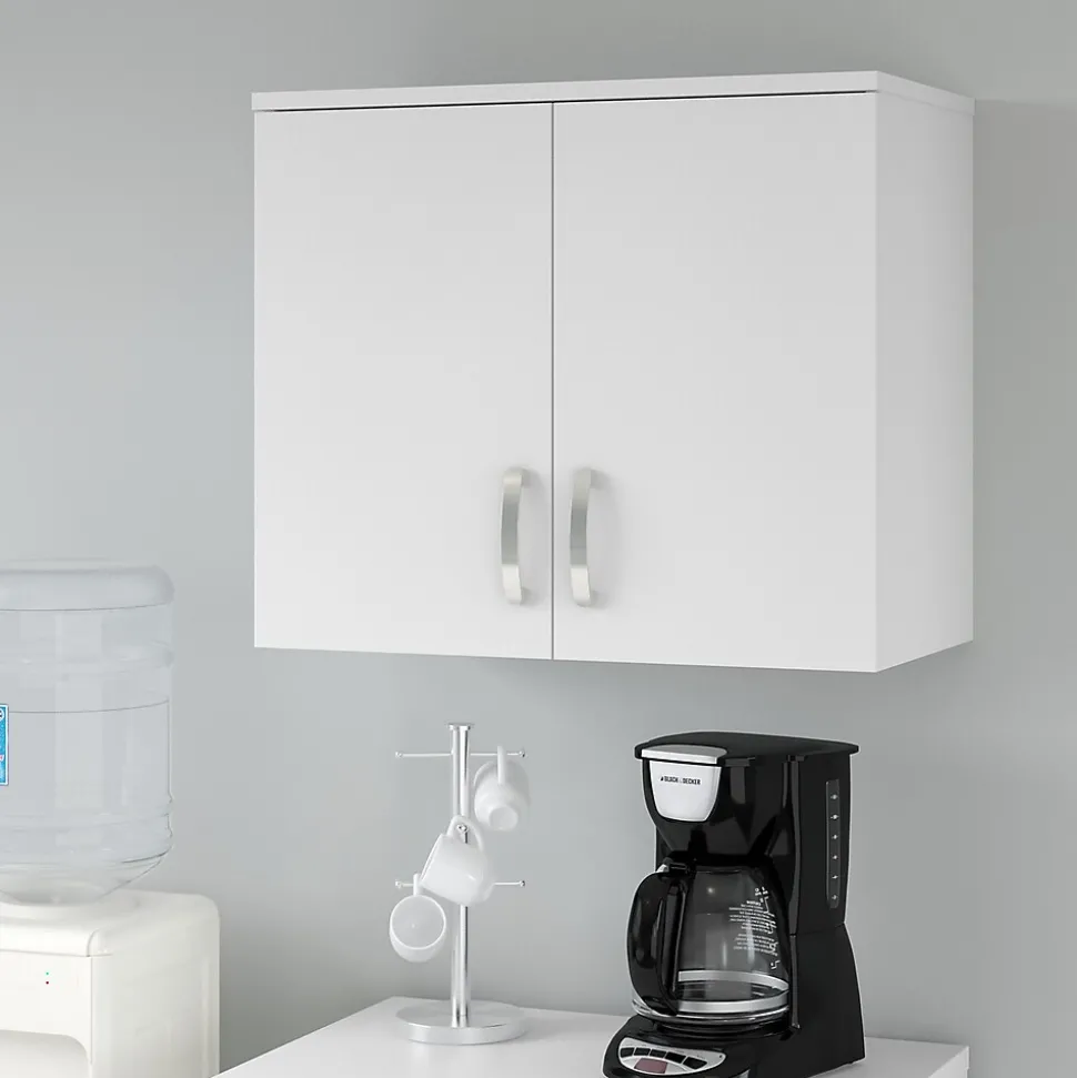 The Bush Business Furniture Universal wall cabinet with doors and shelves features a commercial-quality design and contemporary styling that suits virtually any home or professional environment. Organize your office, break room, garage, laundry room, or any other work or living space with a wall-mounted cabinet that’s built to last and boasts plenty of practical storage capacity. Cabinet doors with smooth Euro-style hinges open to reveal one fixed shelf and one adjustable shelf that accommodate office supplies, tools, and household items of various sizes. The total weight capacity of the small wall cabinet is 30 lbs. For best use, mount wall studs 16″ apart during installation. This wall storage cabinet has been tested to meet ANSI/BIFMA standards for safety and performance and is backed by a 10-year warranty. Complete your space with the full line of Universal modular storage solutions.