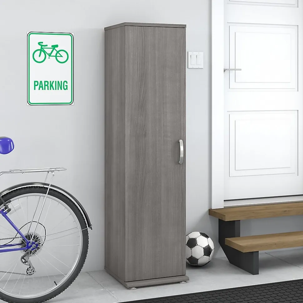 The Bush Business Furniture Universal tall narrow storage cabinet with door and shelves features a commercial-quality design and contemporary styling that suits virtually any home or professional environment. Organize your office, break room, garage, laundry room or any other work or living space with a tall skinny cabinet that’s built to last and boasts plenty of storage capacity. The door opens to reveal one fixed shelf and two adjustable shelves for flexible storage of office supplies, tools, household items, and more. Each shelf supports up to 35 lbs., so storing larger materials and equipment is no problem. The floor cabinet’s base has adjustable levelers to compensate for uneven surfaces, and wall attachment hardware is included for maximum stability. This tall narrow cabinet has been tested to meet ANSI/BIFMA standards for safety and performance and is backed by a 10-year warranty.