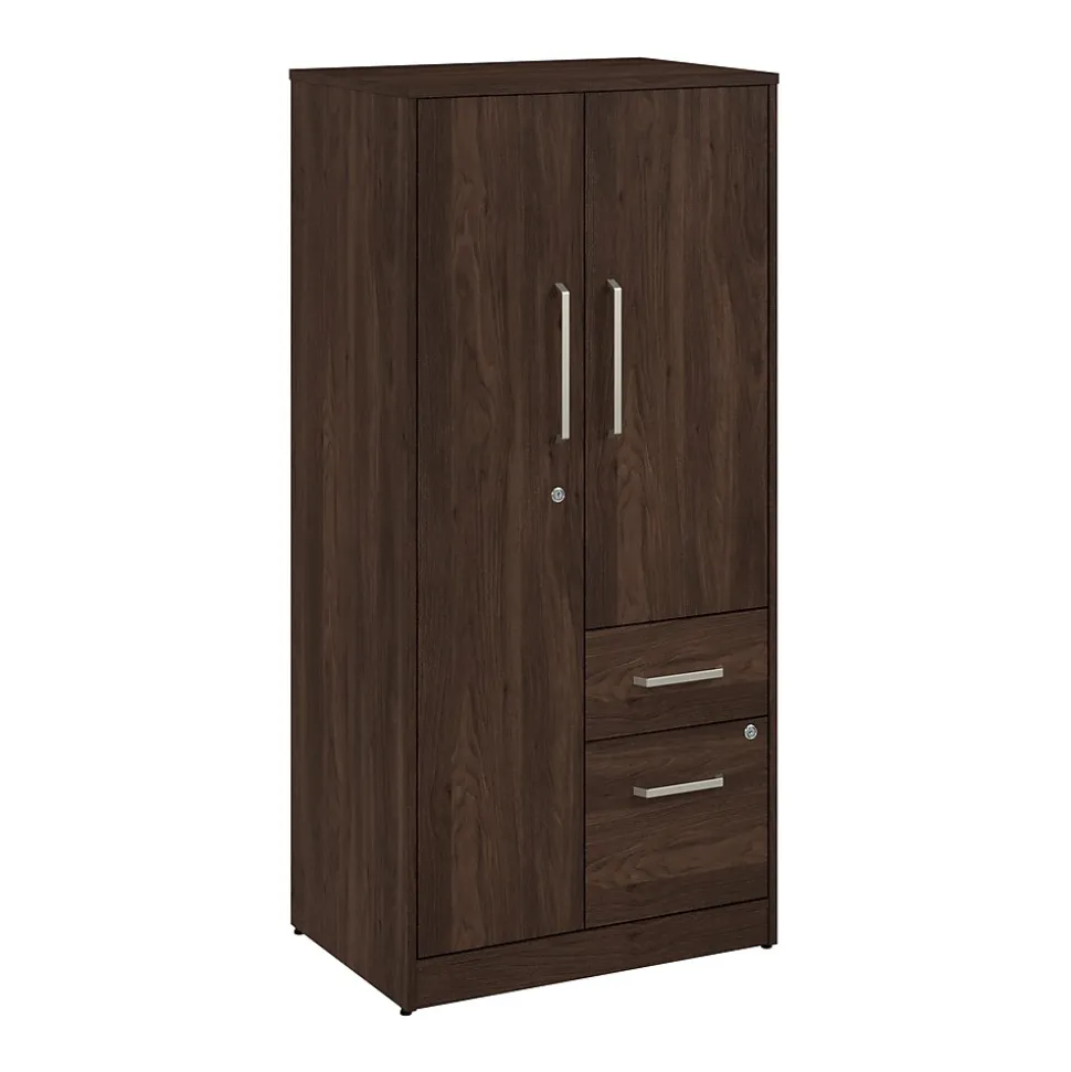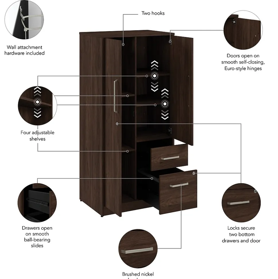 The Bush Business Furniture Vista Wardrobe Cabinet with Drawers keeps any office or workspace organized and clutter-free, adding a modern touch and extra storage where it’s needed. The cabinet features two adjustable shelves behind the left door and two adjustable and one fixed shelf behind the right door. Cabinet doors feature smooth self-closing, Euro-style hinges, and the drawers open smoothly on full-extension ball bearing slides. Thoughtfully designed for maximum stability and includes an optional wall anchor and adjustable levelers. Available in several contemporary finishes paired with attractive brushed nickel hardware. Bush Business Furniture’s commitment to safety includes rigorous testing that meets or exceeds ANSI/BIFMA x5.5 commercial test standards. Backed by a 10 Year Manufacturer’s Warranty and made in North America with globally sourced materials.