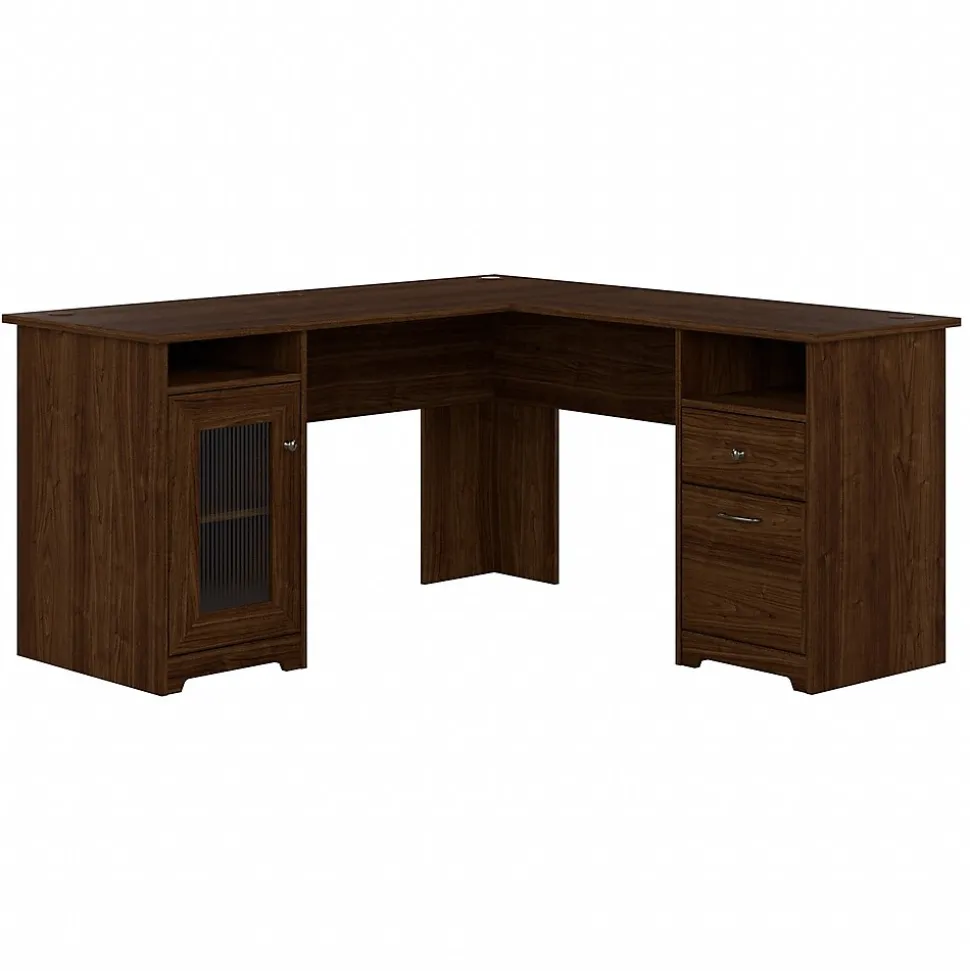The Bush Furniture Cabot 60W L Shaped Computer Desk offers a spacious and efficient workspace for your home office. Enjoy a beautiful traditional look with smart features for your convenience. The L Shaped Desk design provides a large, durable work surface and just the right amount of storage to keep you feeling neat and organized. Storage details include an enclosed cabinet with a stylish fluted glass door and a box drawer for supplies. A file drawer opens on smooth full-extension ball bearing slides for an effortless reach to letter, legal or A4 sized paperwork. A built-in 4-port USB hub keeps your devices connected. The corner desk design saves space but provides you with 60 inches to spread out in either direction. This home office desk with storage is tested to meet ANSI/BIFMA standards for safety and performance and is backed by the Bush Furniture 1 Year Manufacturer’s Warranty.