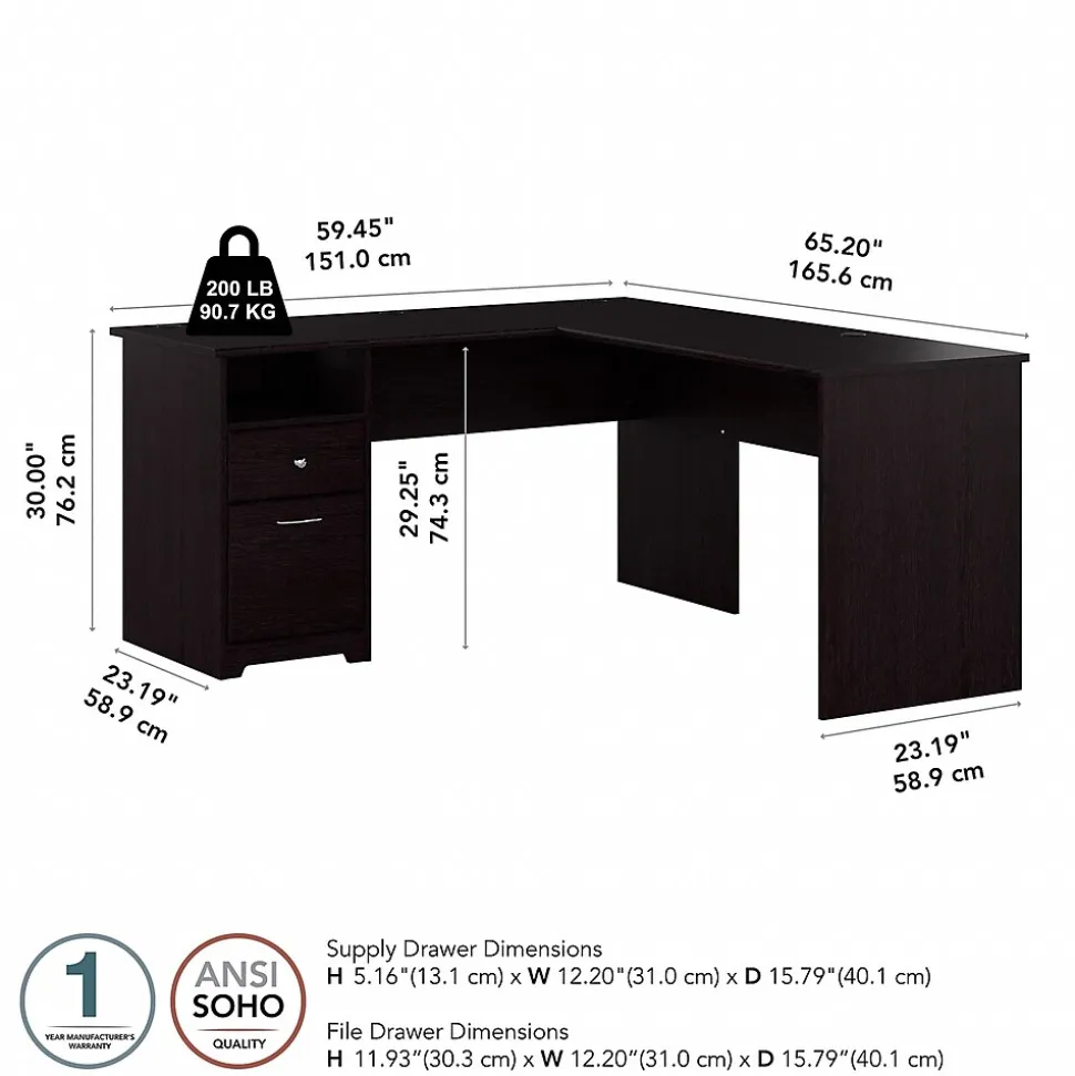 The Bush Furniture Cabot 60W L Shaped Computer Desk with Drawers presents a home office solution with transitional style. Take advantage of the 60-inch L Shaped Desk surface to spread out with a computer and all the materials needed to power through your next project or assignment. The durable desktop supports up to 200 pounds and includes built-in wire management to keep cords and cables out of the way while you work. A single file drawer opens on smooth full-extension ball bearing slides for an effortless reach to letter, legal, and A4-size paperwork. The box drawer organizes writing utensils, notepads, and other small office supplies while the open cubby shelf is perfect for work-in-progress and frequently used materials. This corner desk with storage has been rigorously tested to meet or exceed ANSI/SOHO quality standards for safety and performance and is backed by a 1 Year Warranty.
