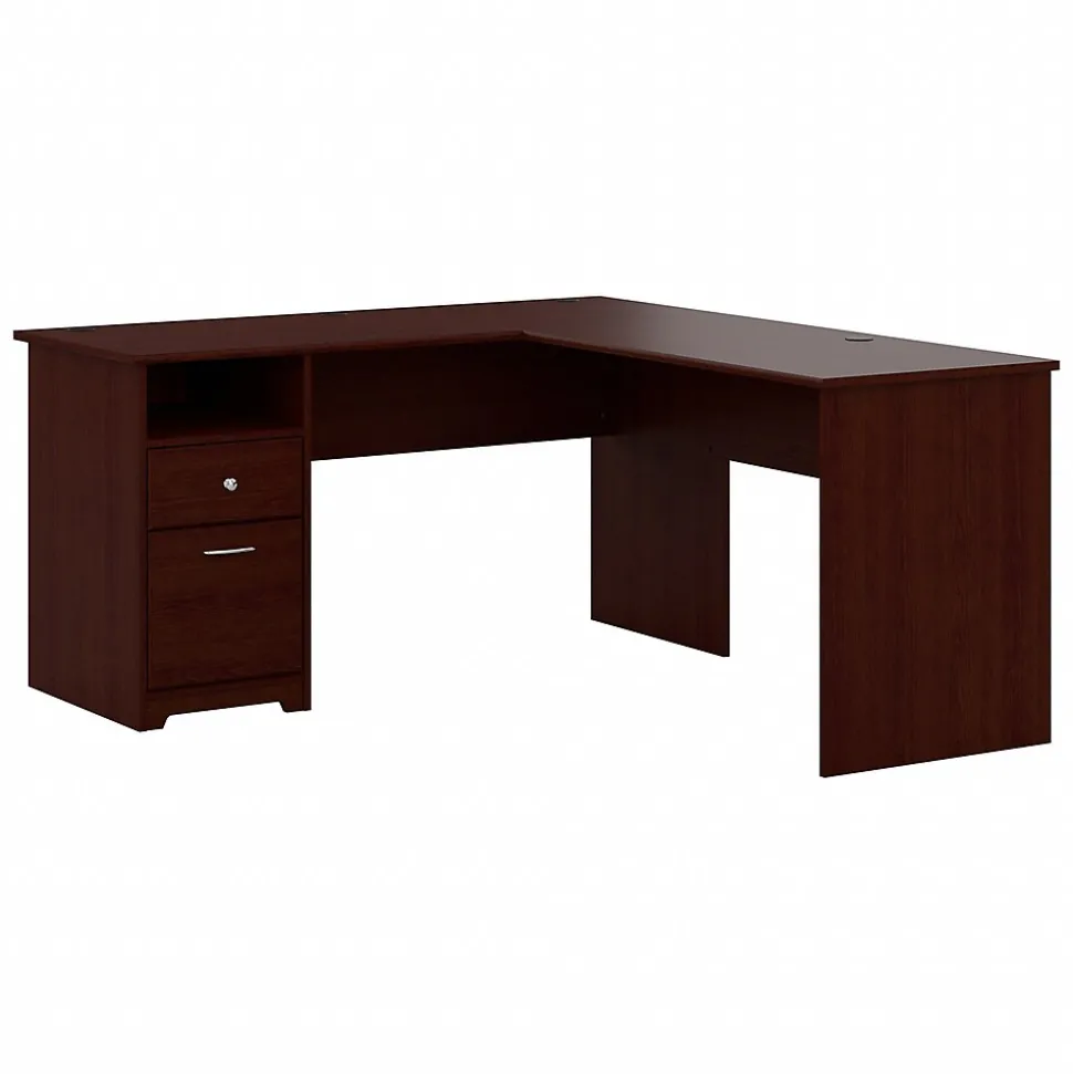 The Bush Furniture Cabot 60W L Shaped Computer Desk with Drawers presents a home office solution with transitional style. Take advantage of the 60-inch L Shaped Desk surface to spread out with a computer and all the materials needed to power through your next project or assignment. The durable desktop supports up to 200 pounds and includes built-in wire management to keep cords and cables out of the way while you work. A single file drawer opens on smooth full-extension ball bearing slides for an effortless reach to letter, legal, and A4-size paperwork. The box drawer organizes writing utensils, notepads, and other small office supplies while the open cubby shelf is perfect for work-in-progress and frequently used materials. This corner desk with storage has been rigorously tested to meet or exceed ANSI/SOHO quality standards for safety and performance and is backed by a 1 Year Warranty.