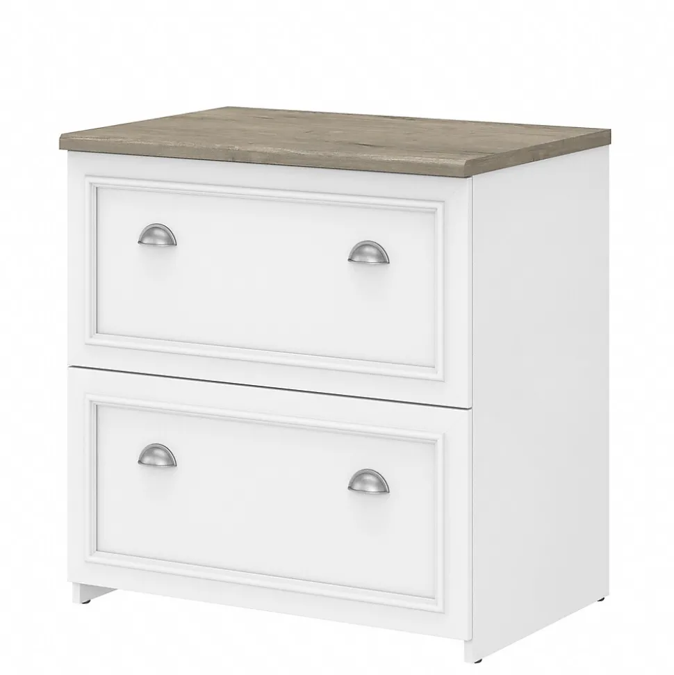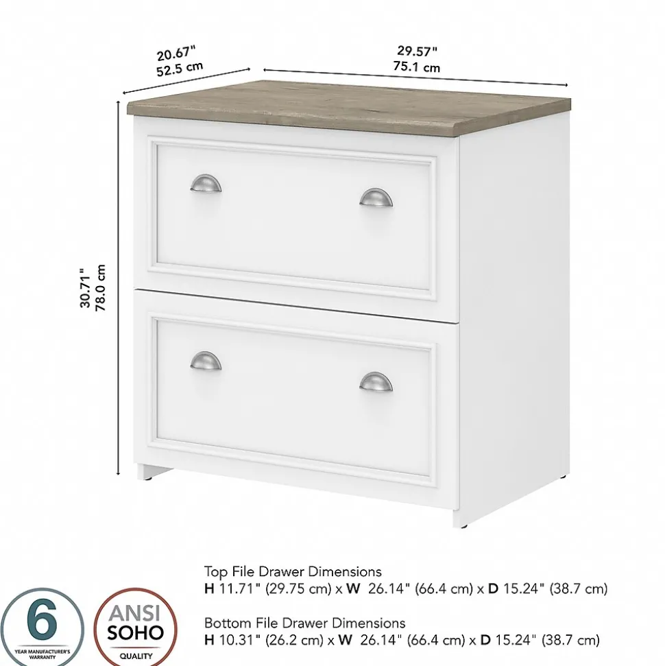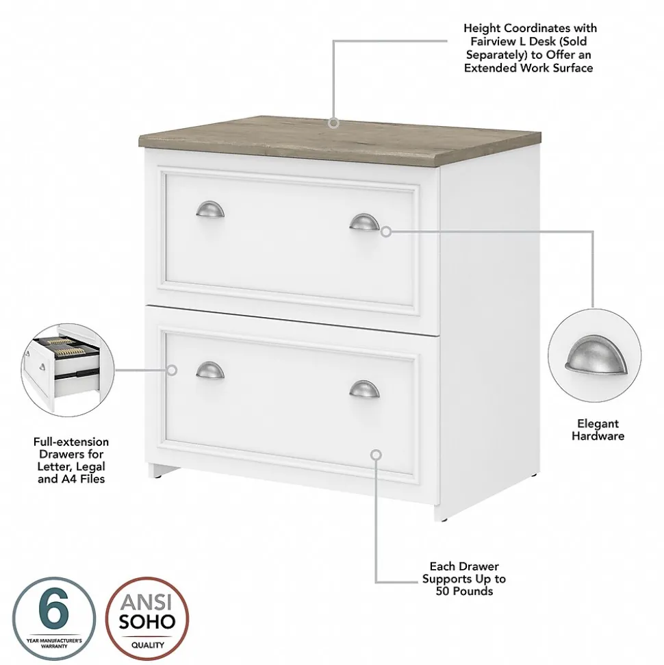 Bring a slice of modern farmhouse styling into your home office and get organized with the Bush Furniture Fairview two-drawer lateral file cabinet. Two large file drawers open on smooth full-extension ball bearing slides for an effortless reach to all your paperwork. The file cabinet’s drawers accommodate letter-, legal-, and A4-size documents and hold up to 50 lbs. of materials each. The two-drawer lateral file cabinet matches the height of the coordinating Fairview L-shaped desk with storage (sold separately) to offer an extended work surface when placed side by side. This farmhouse file cabinet is tested to meet ANSI/SOHO quality standards for safety and performance and is backed by the Bush Furniture 6-year manufacturer’s limited warranty.