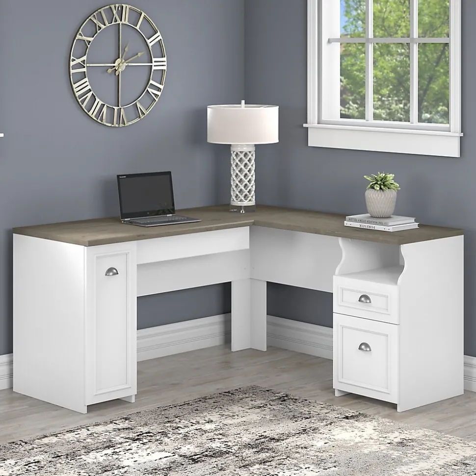 Bring a slice of modern farmhouse styling into your home office with the Bush Furniture Fairview L-shaped desk. Enjoy your morning coffee, surf the net, and pay bills with plenty of room to spare on the corner desk’s spacious and durable work surface. Stash pens, paper, and checkbooks in the box drawer and open cubby space while organizing mail in the letter-size file drawer. A drawer that features a convenient flip-down front makes an excellent keyboard tray or laptop storage shelf, so the desktop remains free for your daily tasks. The L-shaped desk’s vertical storage cabinet contains one adjustable shelf to accommodate office supplies and materials of various sizes. Charming accents and antique pewter hardware add plenty of character to your home office. This farmhouse desk with storage is tested to meet ANSI/SOHO quality standards for safety and performance.