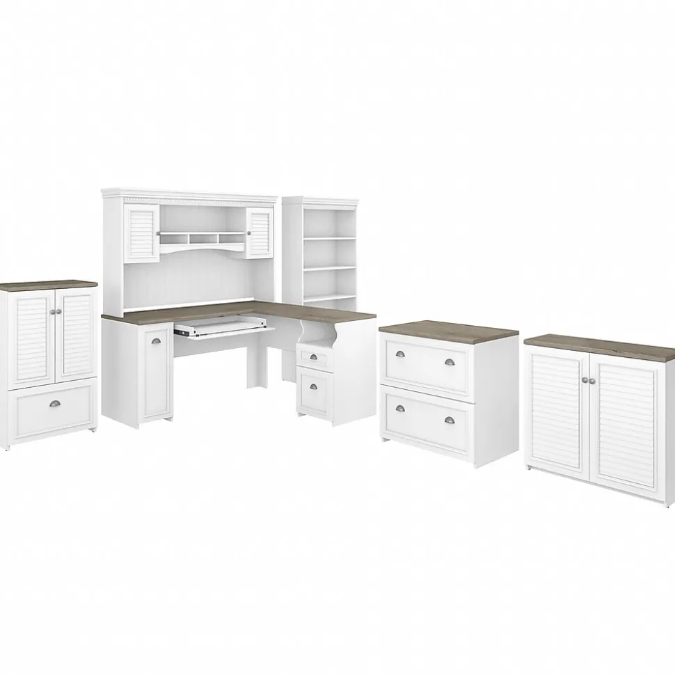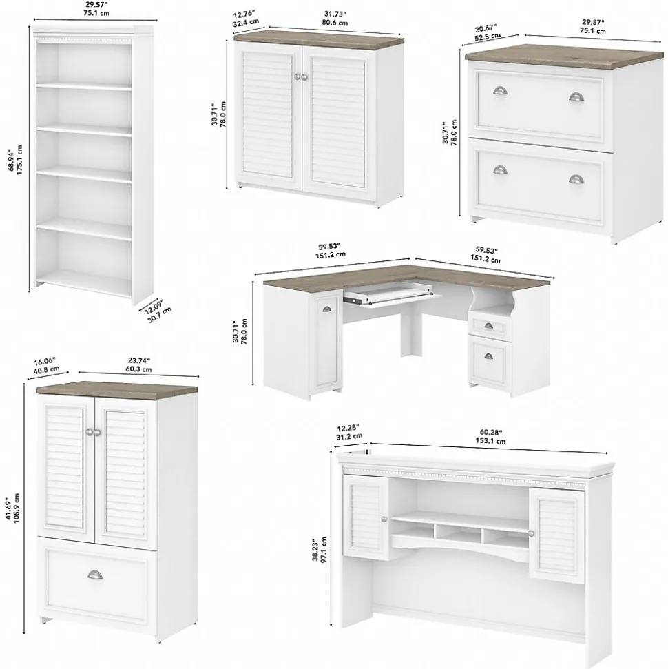 The Bush Furniture Fairview 60″W L-shaped desk with hutch, bookcase, storage, and file cabinets offers a practical home office set with casual cottage style. Enjoy your daily tasks with room to spare on the L-desk’s durable work surface. Stash supplies and mail in the box drawer, file drawer, cubby, and vertical cabinet. A drawer with a drop-down front makes a great keyboard tray or laptop storage shelf. Along with two closed storage areas, the hutch has a large compartment and three smaller shelves for organization. Conceal materials behind the accent cabinets’ louvered doors while taking advantage of the five-shelf bookcase’s open shelving to showcase your personal library. Both the lateral file cabinet and the storage cabinet’s drawer accept letter-, legal-, and A4-size paperwork. This farmhouse desk set is tested to meet ANSI/SOHO standards for safety and performance and is backed by a 6-year manufacturer limited warranty.