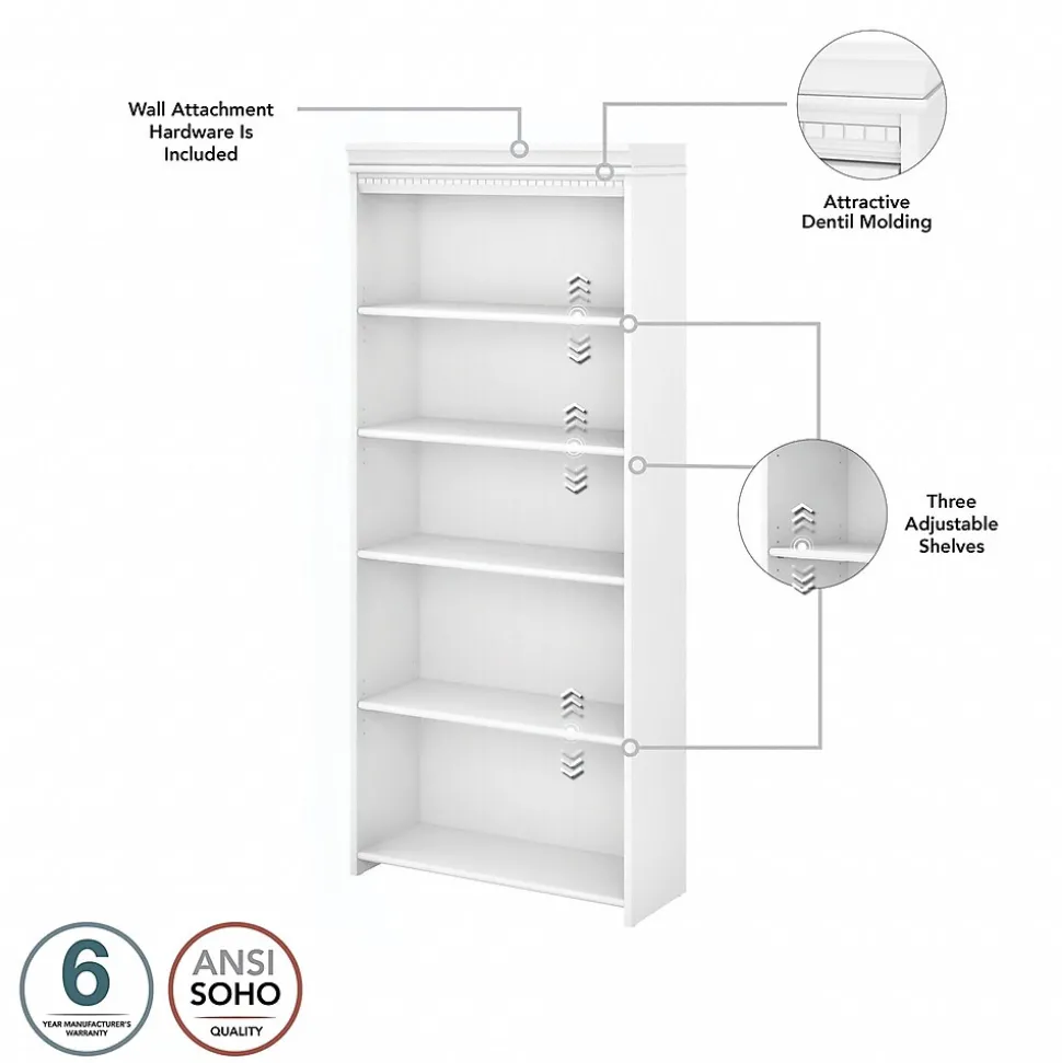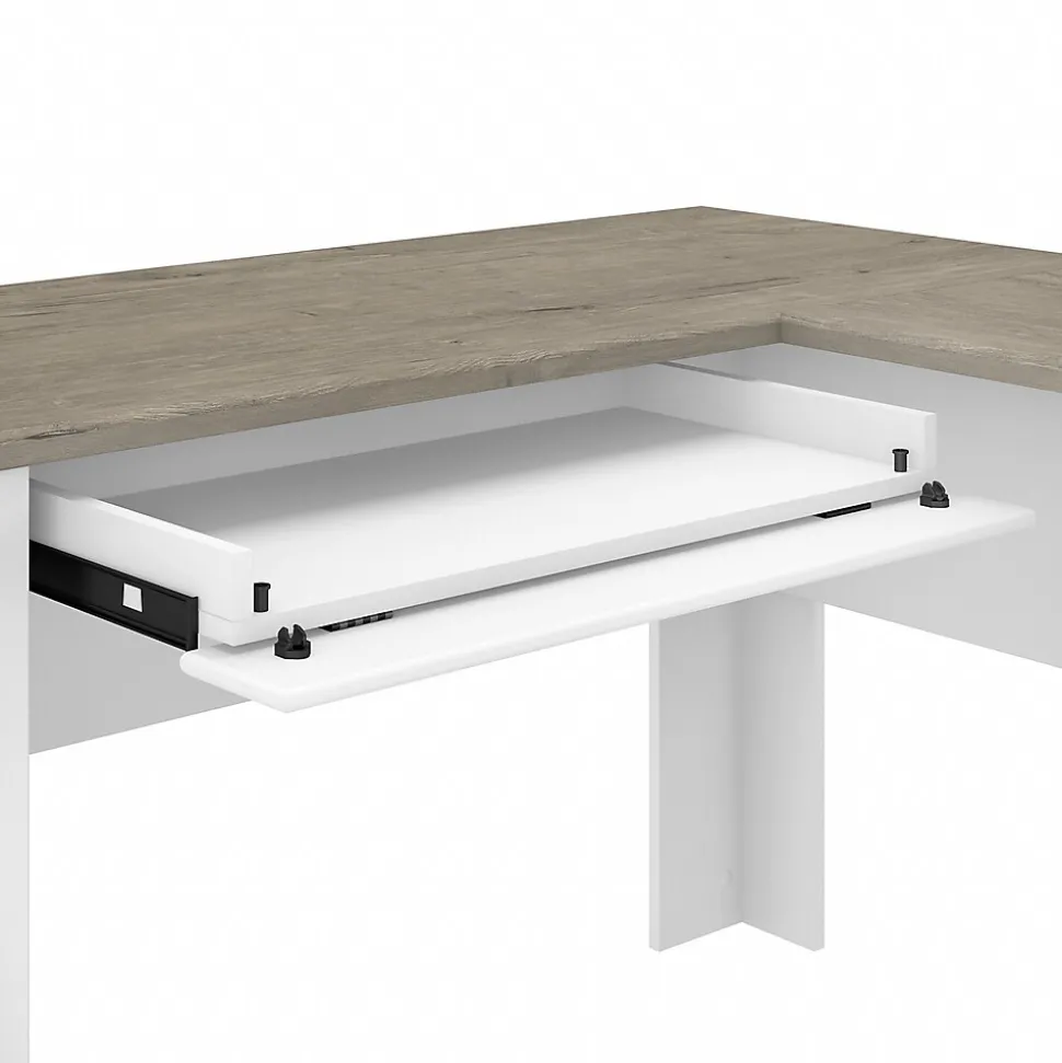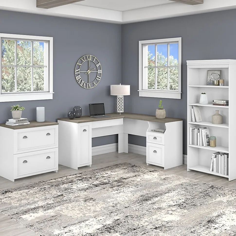 The Bush Furniture Fairview 60″W L-shaped desk with lateral file cabinet and bookcase offers a practical home office set with a comfortable cottage style. The Bush Furniture Fairview 60″W L-shaped desk with lateral file cabinet and five-shelf bookcase offers a practical home office solution that invokes the cozy, welcoming charm of modern farmhouse styling. Enjoy your morning coffee, surf the net, and pay bills with room to spare on the corner desk’s durable work surface. Stash pens, paper, and checkbooks in the box drawer, open cubby, and vertical cabinet while organizing mail inside the letter-size file drawer. A drawer with a drop-down front makes a great keyboard tray or laptop storage shelf. The tall bookcase’s three adjustable and two fixed shelves make it easy to showcase your personal library while supporting up to 50 lbs. each. The two-drawer file cabinet accepts letter-, legal-, and A4-size paperwork. This farmhouse desk set is tested to meet ANSI/SOHO quality standards for safety and performance and is backed by a 6-year warranty.