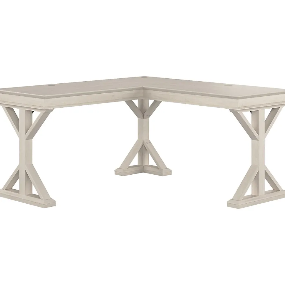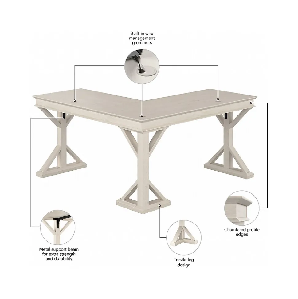 The Bush Furniture Homestead farmhouse 60″W L-shaped desk offers a personal workspace solution with appealing farmhouse style. Tackle your next project or assignment with a computer, books, paperwork, and more on a desktop that supports up to 200 lbs. A built-in wire management grommet keeps cords and cables in order, so your work area remains free from unnecessary clutter. Save space in compact areas by placing the L-shaped desk in a corner, or make it your home office’s centerpiece. The computer desk’s trestle leg design and chamfered profile edges give it a casual farmhouse style. This office desk has been meticulously tested to meet or exceed the ANSI/SOHO quality standards for safety, durability, and performance and is backed by a 1-year manufacturer warranty. See the full collection for coordinating items available.