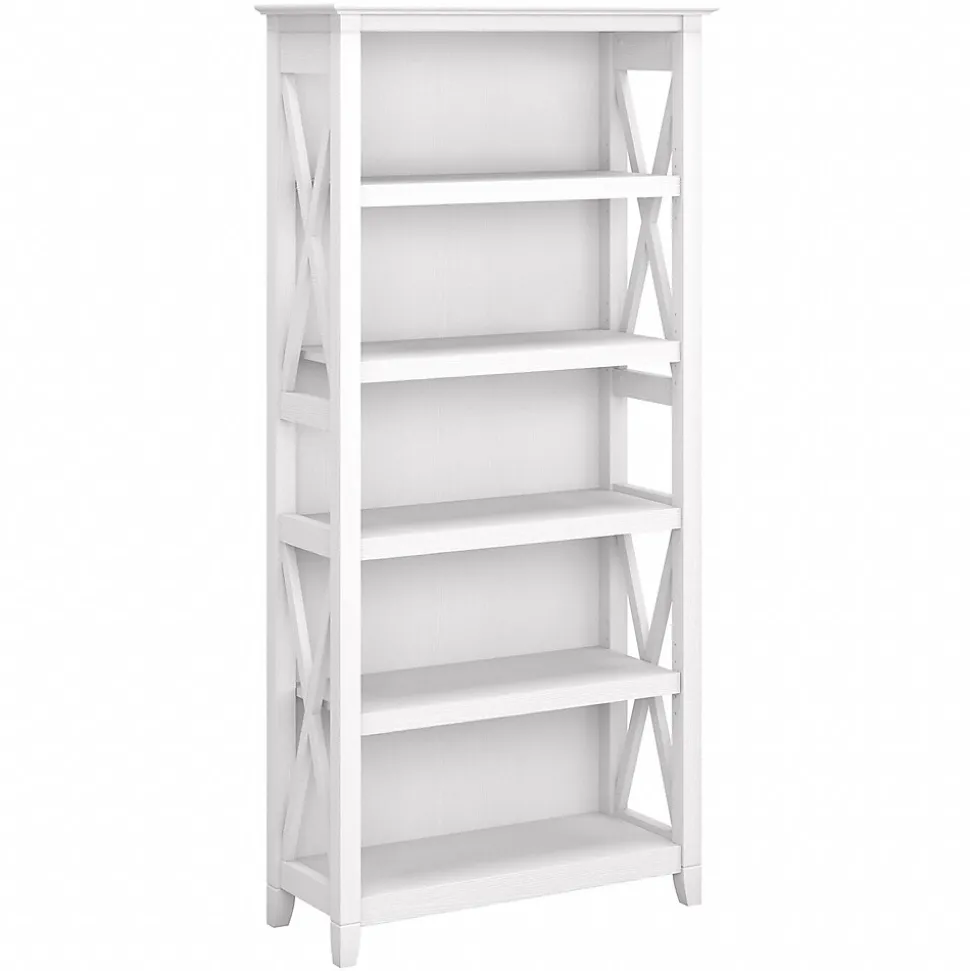 The Bush Furniture Key West five-shelf bookcase is a perfect way to show off your favorite artwork, photos, plants, and more. Three adjustable shelves accommodate items of various sizes while two fixed shelves provide stability. Each shelf supports up to 25 lbs. so you can store your personal library and display decorations with confidence. Stylish touches include unique X pattern accents on the side panels as well as a sturdy and attractive post leg design. This five-tier bookcase includes wall attachment hardware for family-friendly safety and security in any home office or living room. A perfect choice for homes that embrace cottage, coastal, and farmhouse decor, the Key West collection includes a variety of coordinating items to expand your space as needed. This tall bookcase is tested to meet ANSI/SOHO quality standards for safety and performance and is backed by a 1-year warranty.
