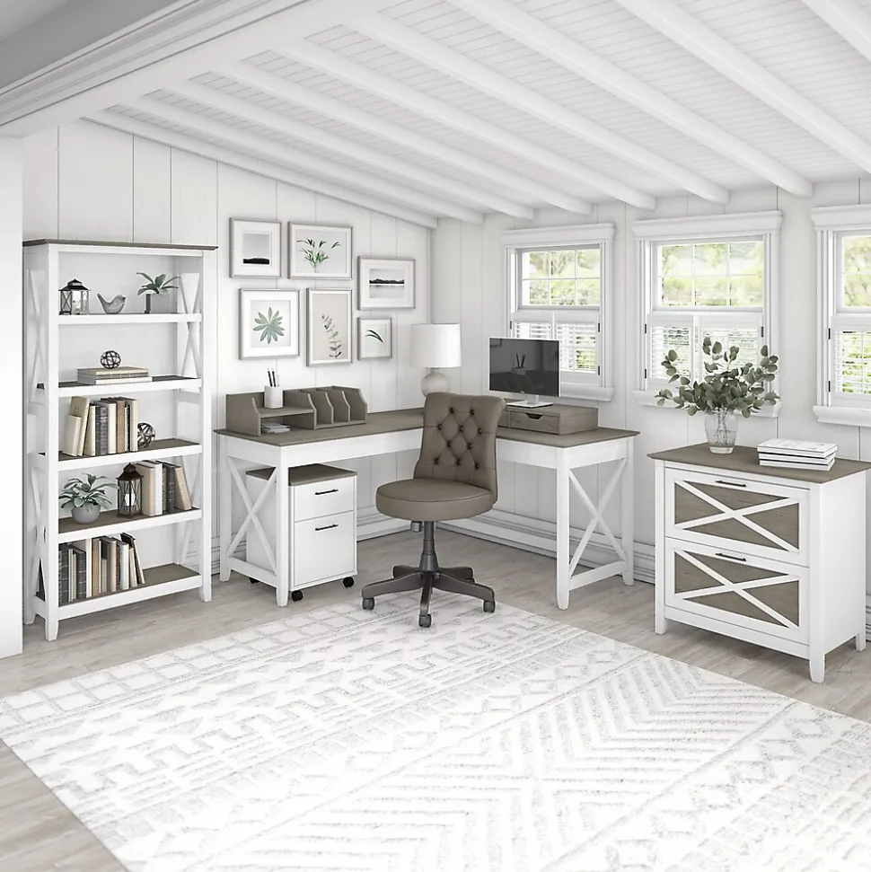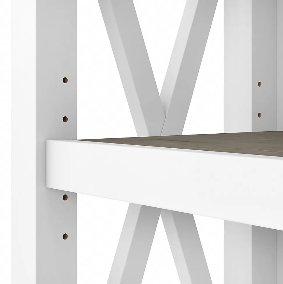 The Bush Furniture Key West tall five-shelf bookcase is a perfect way to show off your favorite artwork, photos, plants, and more. Three adjustable shelves accommodate items of various sizes while two fixed shelves provide stability. Each shelf supports up to 50 lbs. so you can store your personal library and display decorations with confidence. Stylish touches include unique X-pattern accents on the side panels as well as a sturdy and attractive post leg design. This five-tier bookcase includes wall attachment hardware for family-friendly safety and security in any home office or living room. A perfect choice for homes that embrace cottage, coastal, and farmhouse decor, the Bush Furniture Key West collection includes a variety of coordinating items to expand your space as needed. This tall bookcase is tested to meet ANSI/SOHO quality standards for safety and performance and is backed by a 1-year manufacturer warranty.