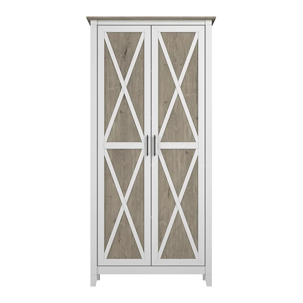 The Bush Furniture Key West Tall Storage Cabinet with Doors and Shelves offers an organization solution that brings a touch of casual style to any residential space. Featuring a design that’s as versatile as it is practical, this 2 door farmhouse cabinet provides an ideal way to store important work materials, a collection of books or other media, miscellaneous household items and more. Two shelves are fixed for stability while three can be raised or lowered to accommodate items of various sizes. Each shelf supports up to 25 pounds, so storing larger materials and equipment is never a problem. The stable design also includes wall attachment hardware for family-friendly safety in any home office or living space. This tall accent cabinet with doors has been meticulously tested to meet or exceed industry standards for safety and performance and is backed by a 1 Year Manufacturer’s Warranty.