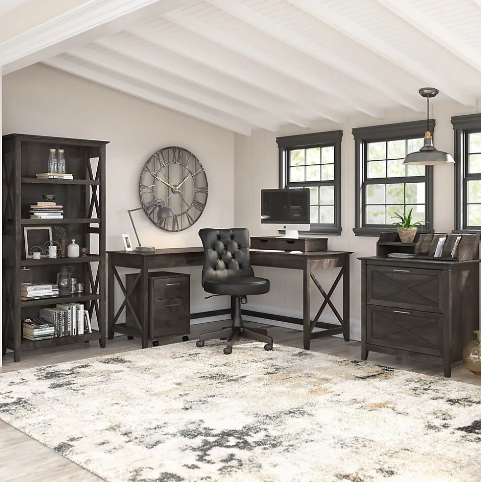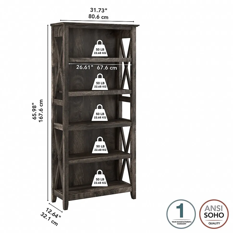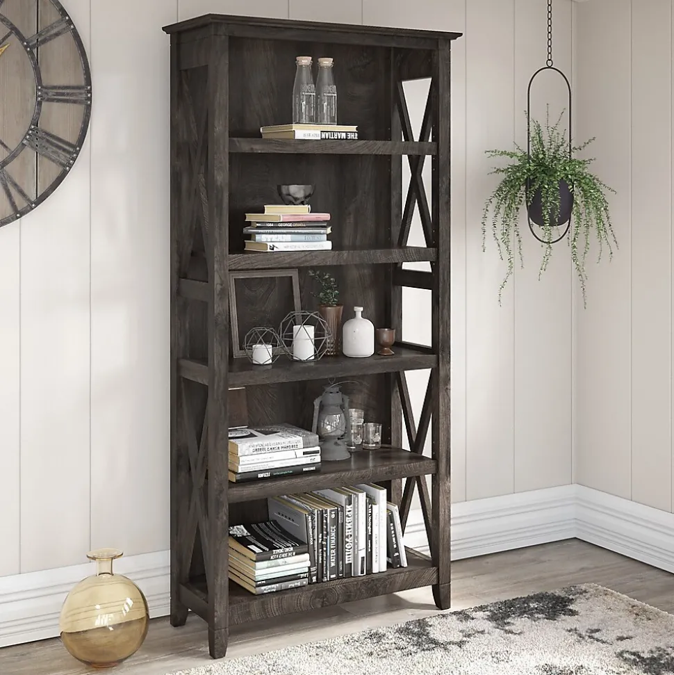 The Bush Furniture Key West tall five-shelf bookcase is a perfect way to show off your favorite artwork, photos, plants, and more. Three adjustable shelves accommodate items of various sizes while two fixed shelves provide stability. Each shelf supports up to 50 lbs. so you can store your personal library and display decorations with confidence. Stylish touches include X-pattern accents on the side panels as well as a sturdy and attractive post leg design. This five-tier bookcase includes wall attachment hardware for family-friendly safety and security in any home office or living room. A perfect choice for homes that embrace cottage, coastal, and farmhouse decor, the Bush Furniture Key West collection includes a variety of coordinating items to expand your space as needed. This tall bookcase is tested to meet ANSI/SOHO quality standards for safety and performance and is backed by a 1-year manufacturer warranty.