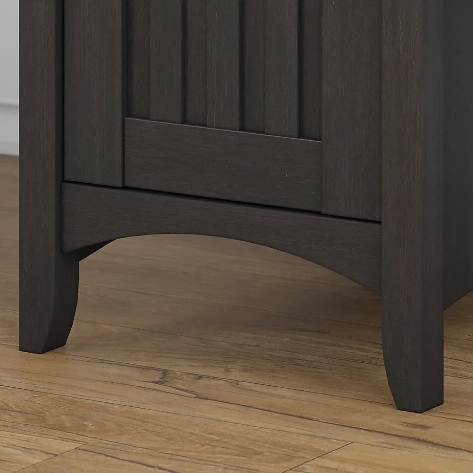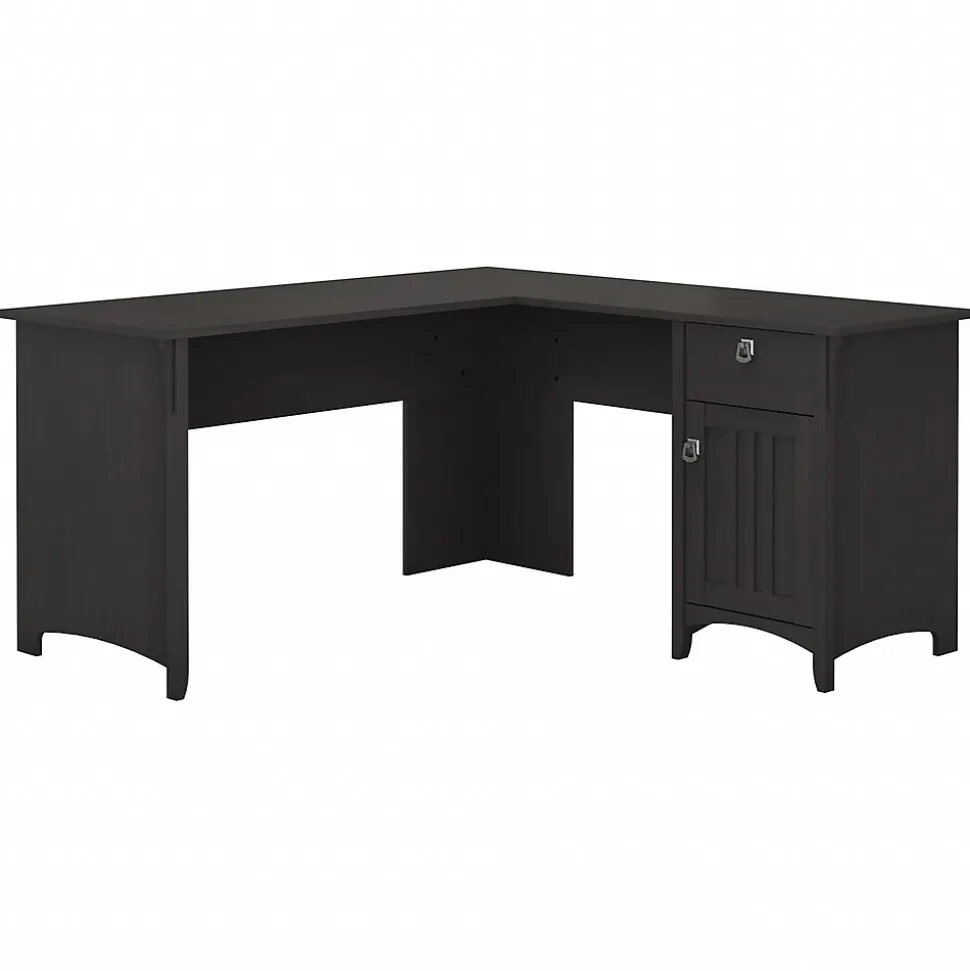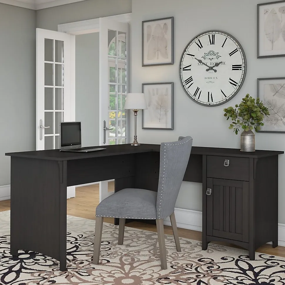 Make your home office space comfortable, functional and beautiful with the Bush Furniture Salinas L Shaped Desk. Attractive wood details, vertical accents and tapered legs create a casual look fit for a cottage, family home or apartment. Metal drop pull hardware complements the Vintage Black finish, which features a distressed touch to add a country feel to your space. You’ll love all the room you have to multitask on the L Shaped Desk surface, designed to save space in your home with a variety of placement options, including in the corner. Have a cup of coffee as you surf the net, pay bills or read a good book, and enjoy all the legroom you need with the open design. A box drawer stores small office items while a storage cabinet includes an adjustable shelf for larger supplies. Backed by a 1 Year Warranty, the L Shaped Desk with Storage meets ANSI/SOHO standards for safety and quality.