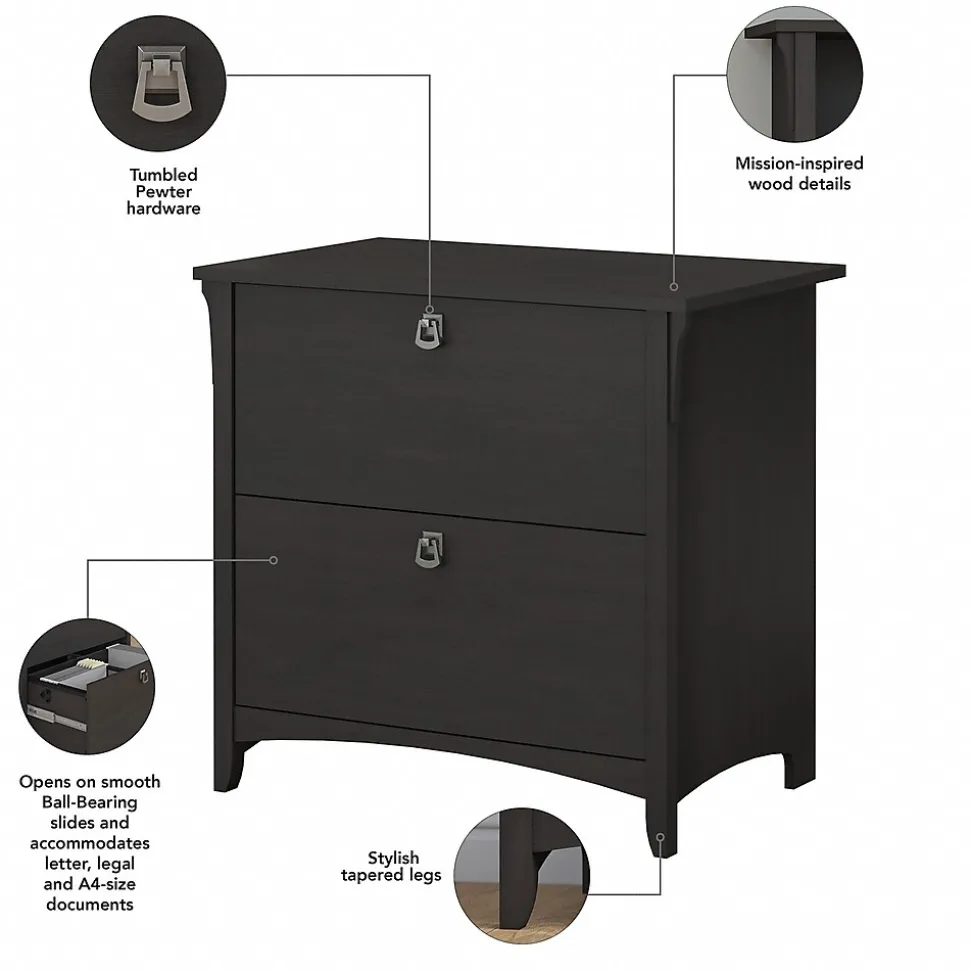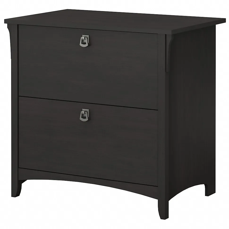File your worries away in a Cabinet that’s as beautiful as it is functional. The Bush Furniture Salinas Lateral File Cabinet creates a casual feel in your home office with decorative wood details, curved base rails and elegant metal drop pull hardware. A pair of file drawers open on smooth full-extension ball-bearing slides so you’ll have no trouble reaching papers in the back. The black Cabinet holds all your letter and legal-size files so you’ll always feel organized. Finished in an on-trend Vintage Black with a slightly distressed touch, the country charm of the Lateral File Cabinet looks great wherever you call home. Backed by a Bush Furniture 1 Year Manufacturer’s Warranty, the 2 drawer Cabinet meets ANSI/SOHO standards for safety and quality.
