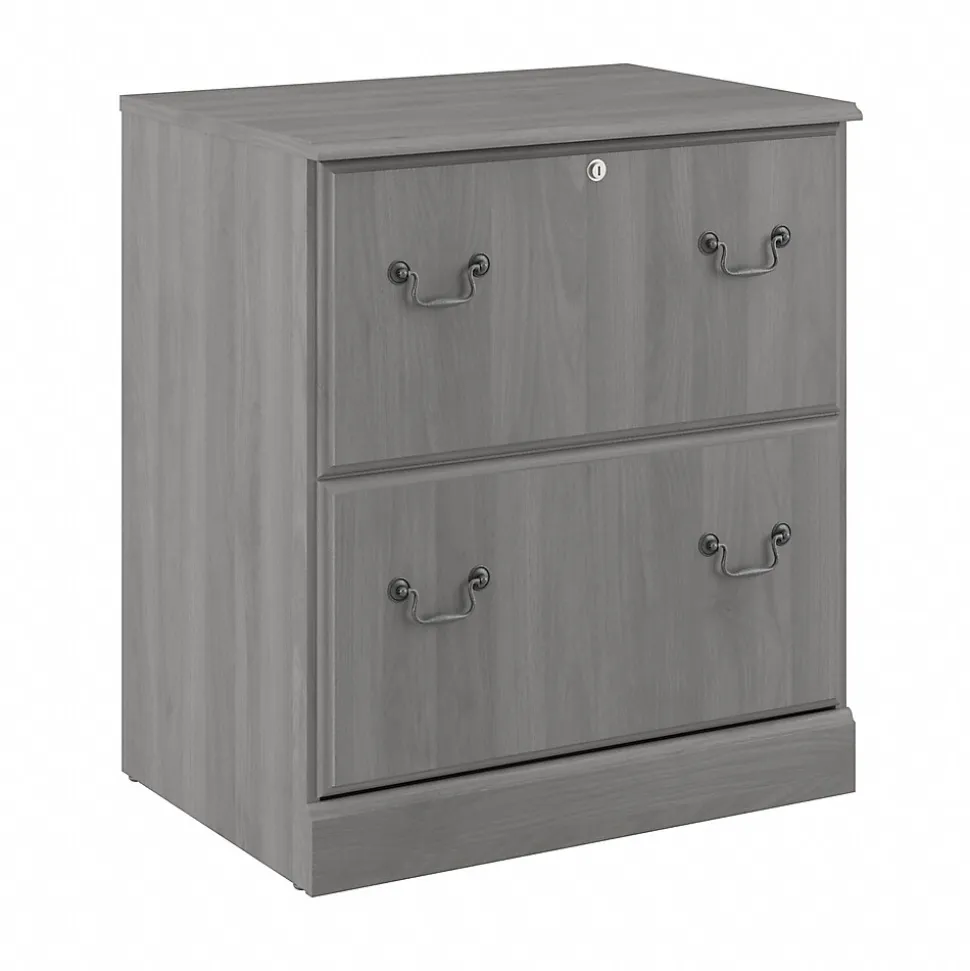 Enjoy the refined elegance of timeless traditional styling while keeping paperwork in order with the Bush Furniture Saratoga two-drawer lateral file cabinet. A perfect choice for virtually any office or private study, the file cabinet features two spacious file drawers that accept letter-, legal-, and A4-size documents. Drawers open on smooth full-extension ball bearing slides for an effortless reach to contents and are designed to extend one at a time for maximum stability. Each drawer holds up to 60 lbs. of materials, and the upper drawer can be locked to protect your personal information and other sensitive paperwork. The two-drawer file cabinet’s classic appearance is enhanced by decorative edge details and old-fashioned drop handle drawer pulls. This locking file cabinet has been tested to meet ANSI/BIFMA quality standards for safety and performance and is backed by a 10 Year Manufacturer’s Warranty.