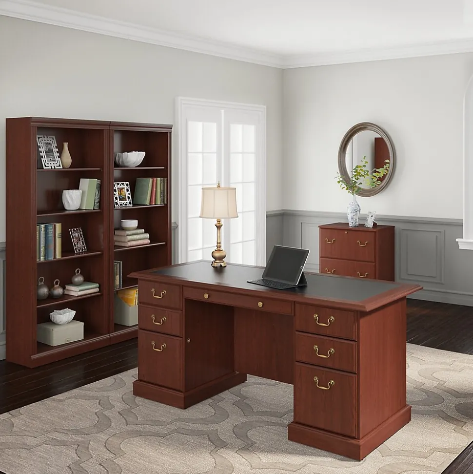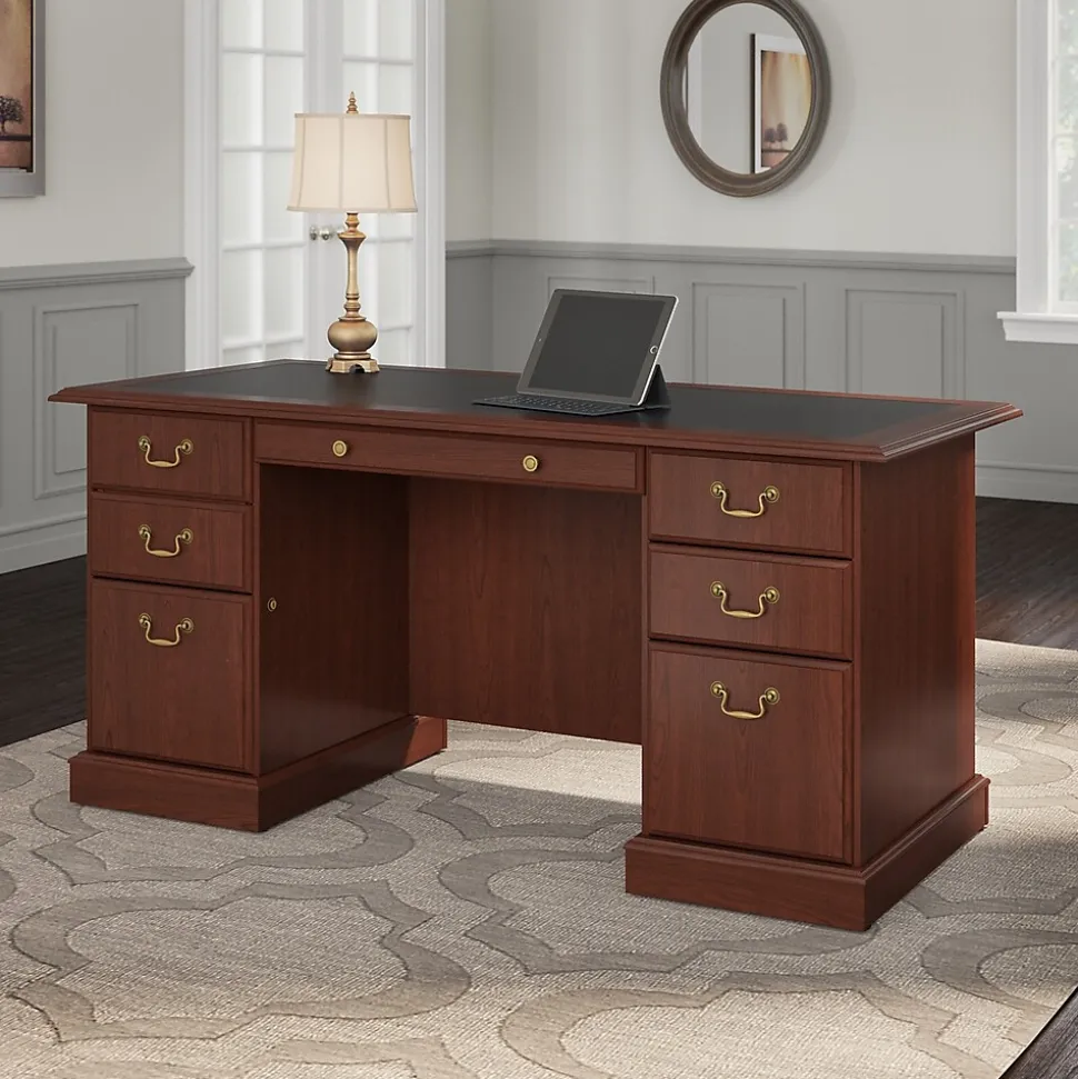 The Bush Furniture Saratoga Executive Desk offers luxurious looks at a lasting value. Pen letters, pay bills or outfit your professional-grade home or private office with a traditional Executive Desk built for everyday use. The durable thermally fused laminate finish lasts for years while resisting scratches and stains. A Black desktop insert further protects the wide work surface and enhances the warm Harvest Cherry finish. Gold-finished Brass hardware and timeless design accents match the traditional styling of your home office or professional workspace. Not just for looks, the Executive Desk contains three full-extension file drawers gliding on smooth ball-bearing slides for easy access to contents. Two box drawers and the center pencil drawer accommodate writing utensils and office supplies. Backed by a 10 Year Warranty, Saratoga meets ANSI/BIFMA performance and safety standards.