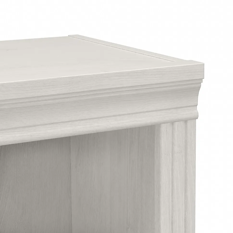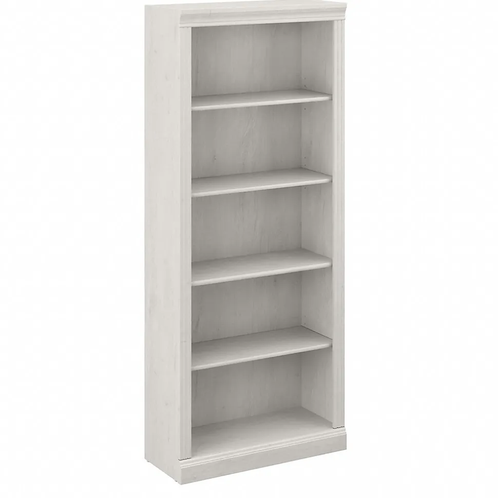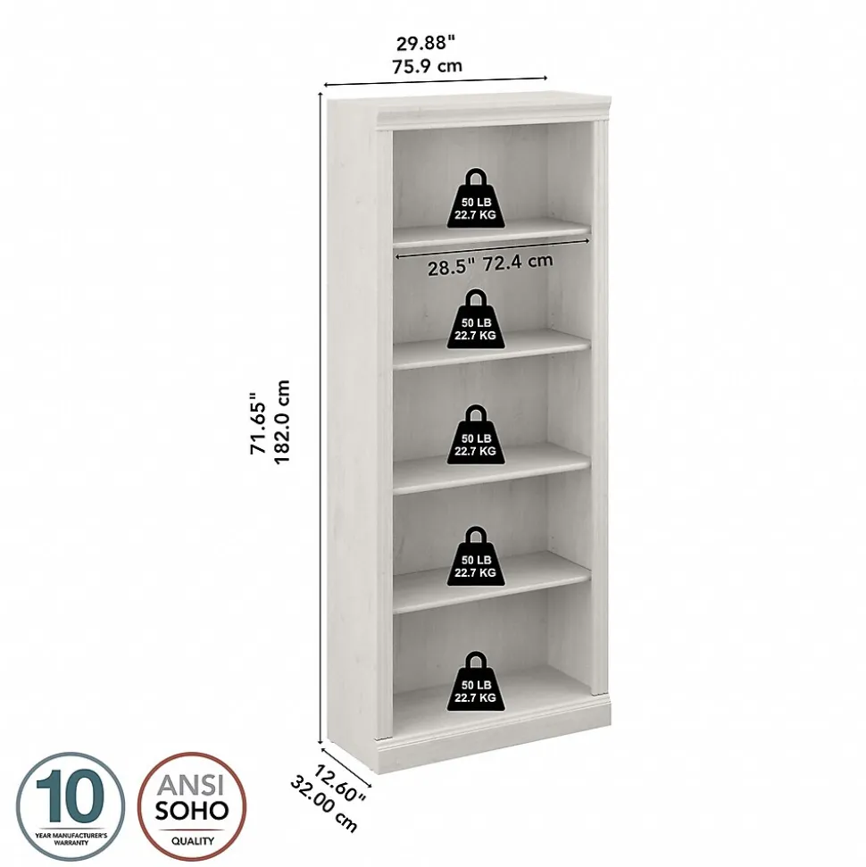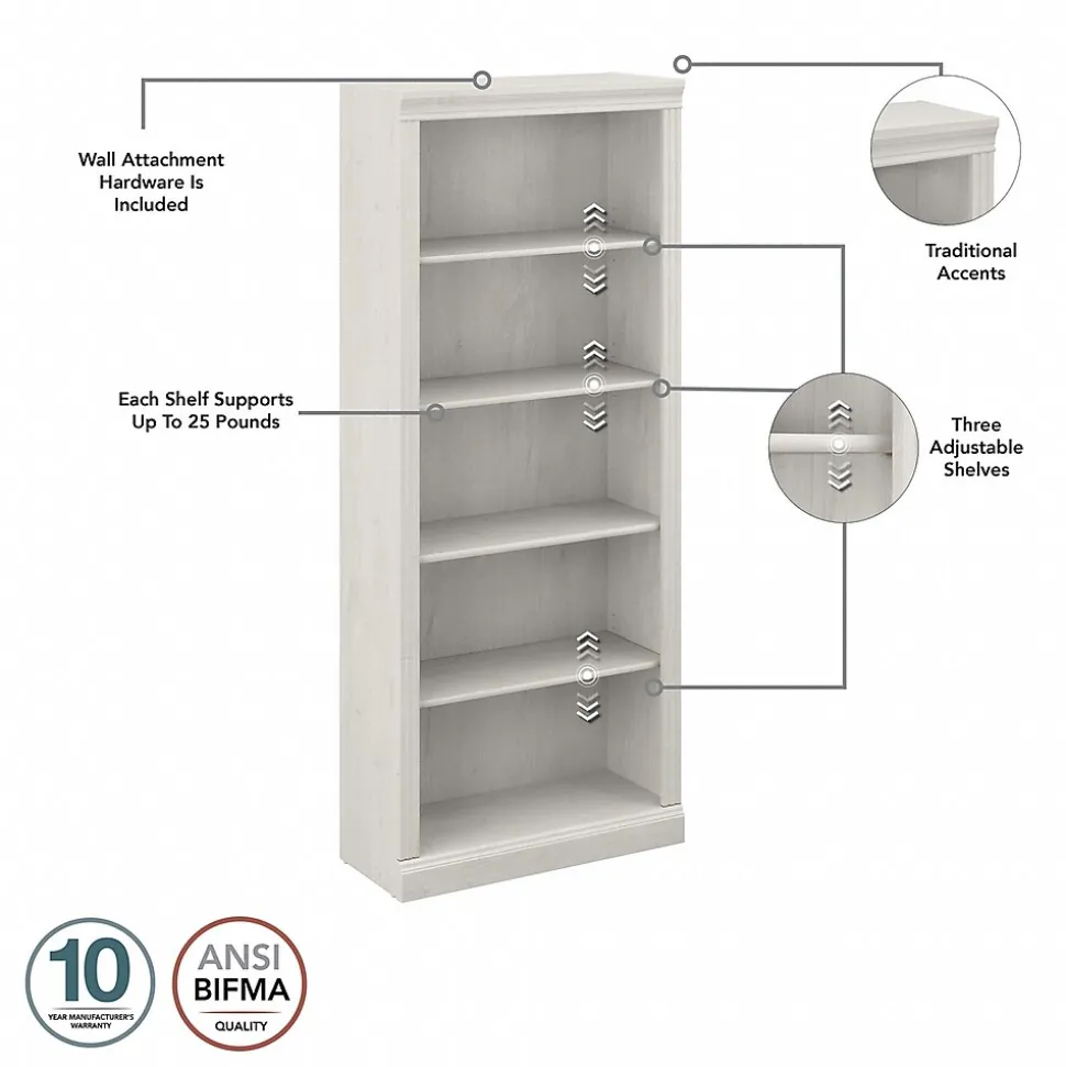 Enjoy the refined elegance of timeless traditional styling while showcasing your favorite books and decorations with the Bush Furniture Saratoga tall five-shelf bookcase. A perfect choice for virtually any office or private study, this vertical bookcase features three adjustable shelves for flexible storage space and two fixed shelves for strength and stability. Each shelf supports up to 25 lbs., so you can organize your personal library and display larger items with confidence. Hardware is included to safely anchor the tall bookcase to a wall. The bookcase’s classic appearance is enhanced by decorative top, base, and side rail detailing. This tall bookcase has been tested to meet ANSI/BIFMA standards for safety and performance and is backed by a 10-year warranty. Complete your workspace with a Saratoga desk, lateral file cabinet, and office chair (coordinating items sold separately).